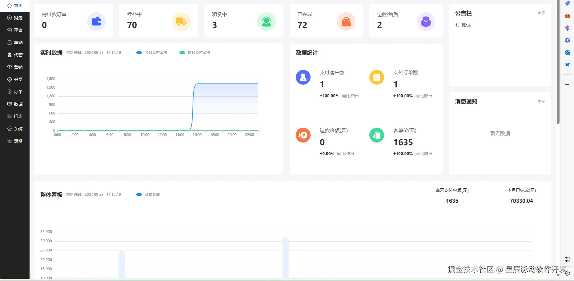 首页可查看租车的一些实时数据:待付款订单、候补中、租赁中、已完成、退款售后的数量、实时的数据统计、利用图表更清晰的展示数据。