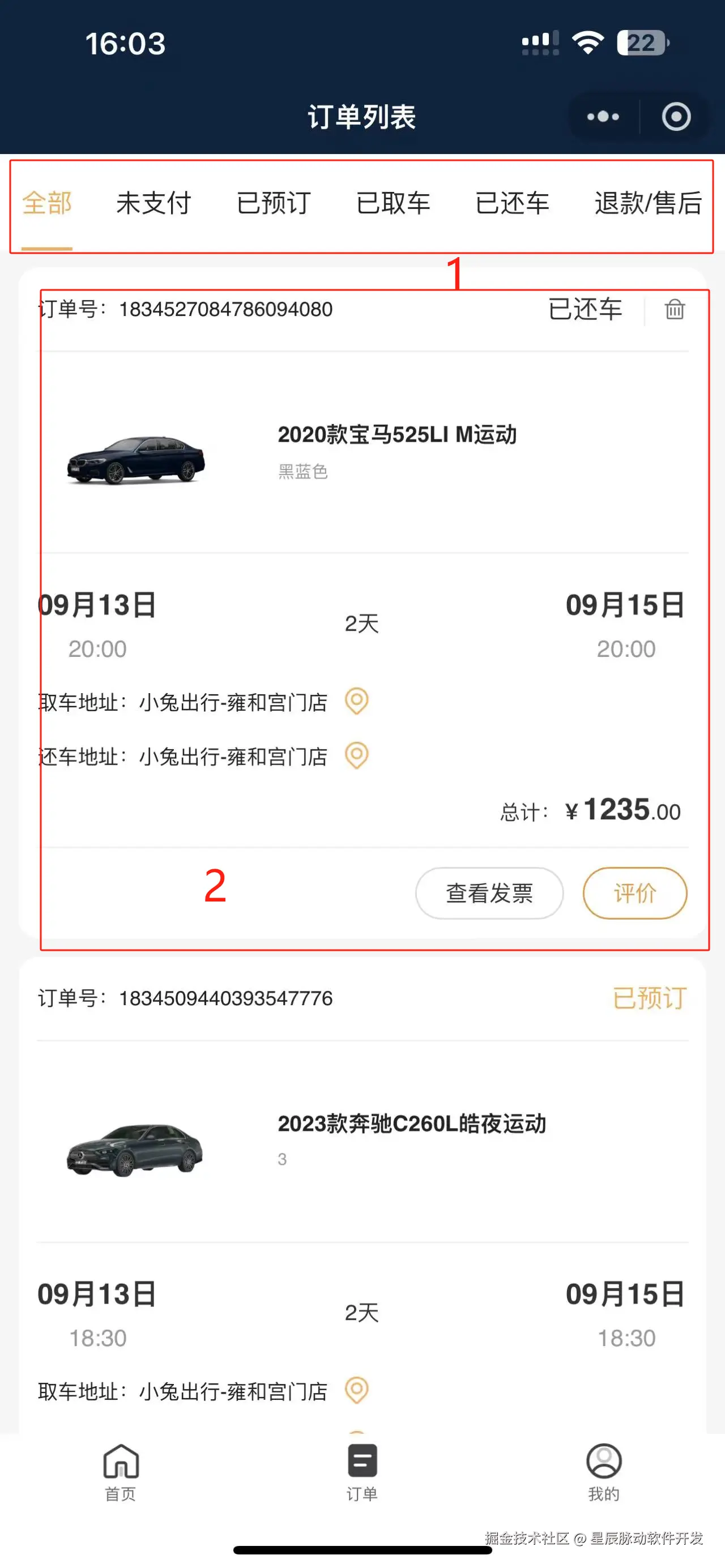 2.订单信息:订单号、车辆信息、租用日期、天数、取换车地址、金额、可删除订单、查看发票、评价等
