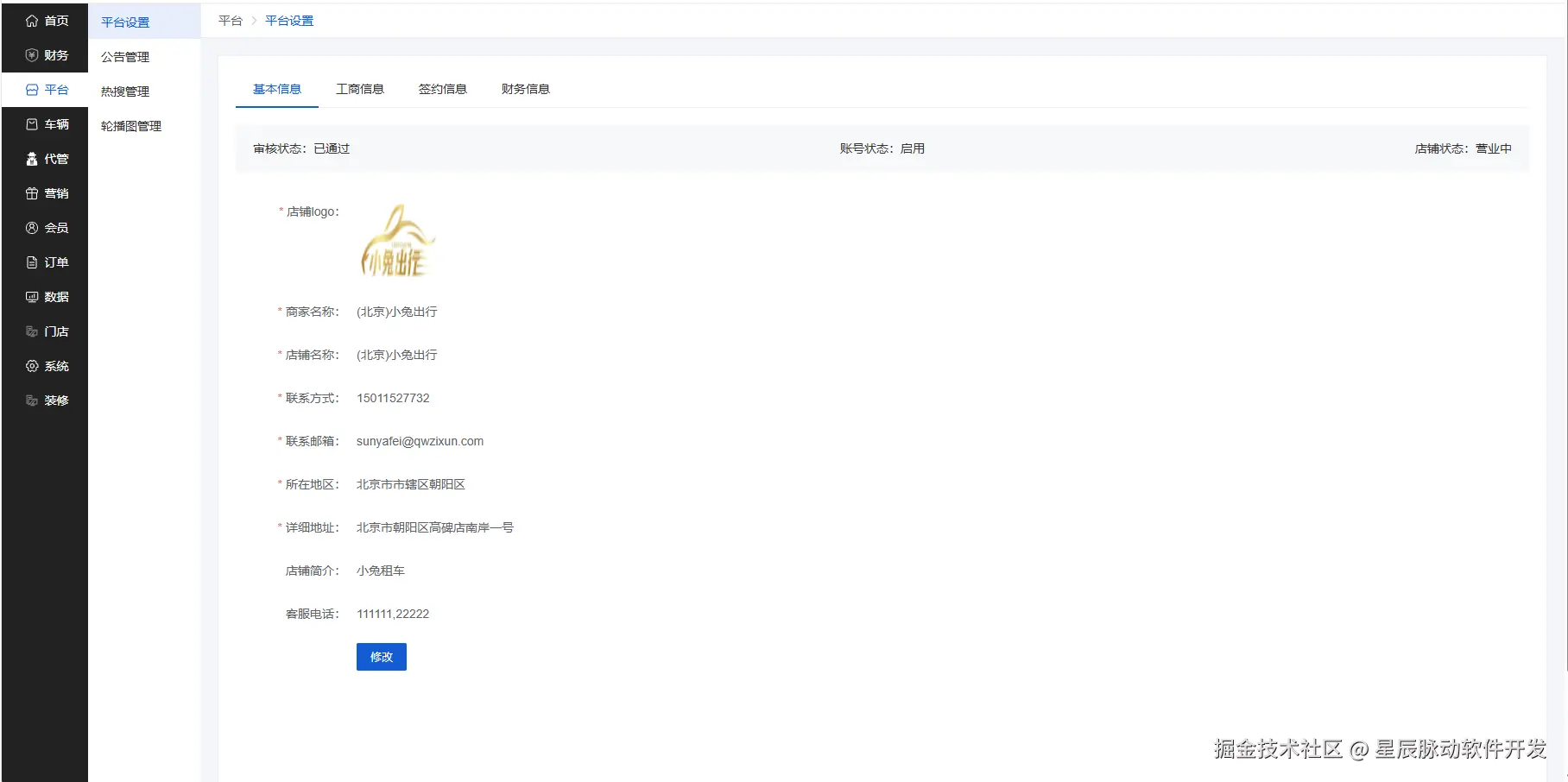 点击平台-平台设置可查看查看或修改店铺的基本信息、工商信息、签约信息、财务信息