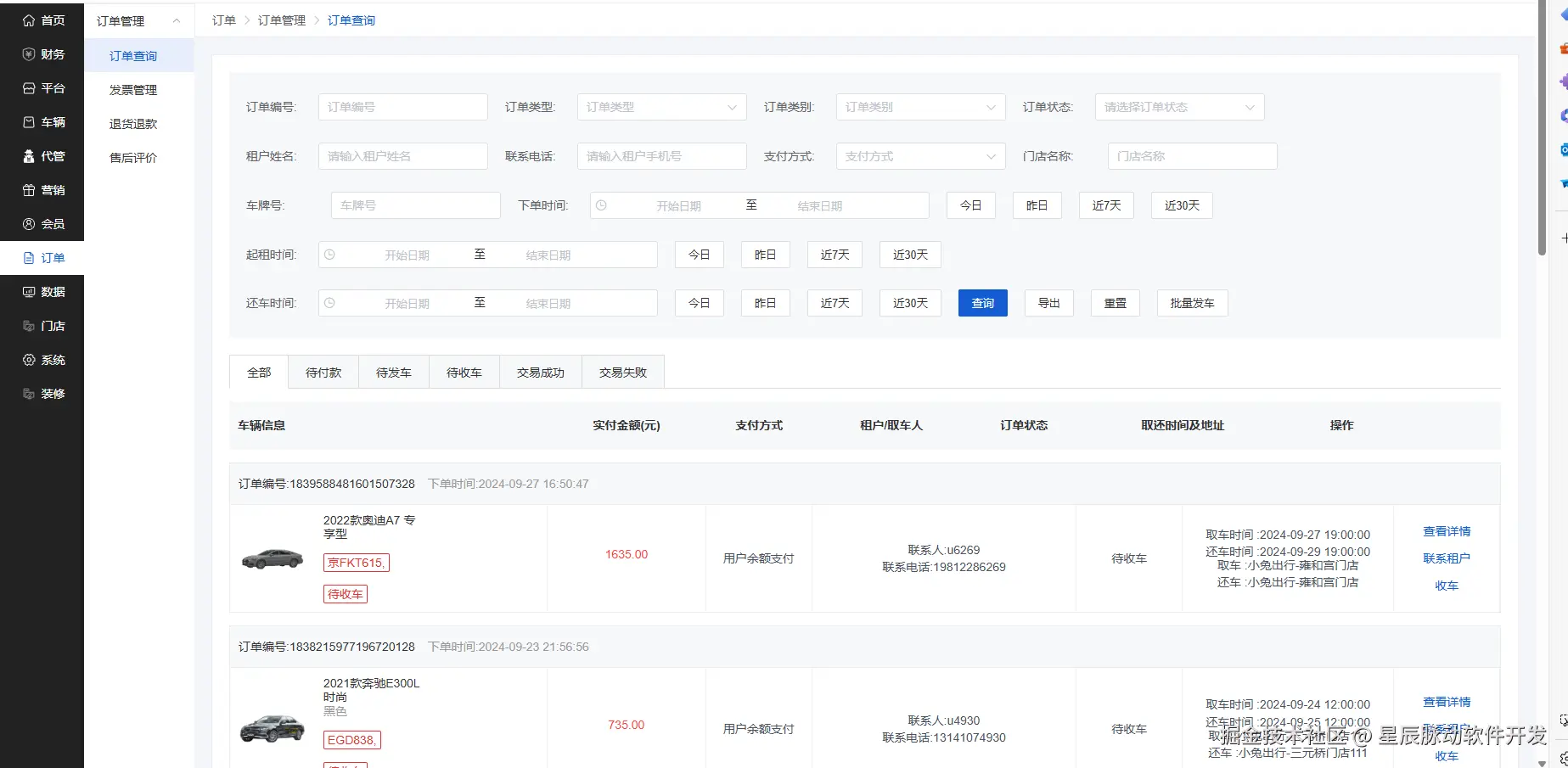 订单管理:查看订单的信息:车辆信息、下单时间、金额、租车用户信息、订单状态、可通过筛选条件进行筛选