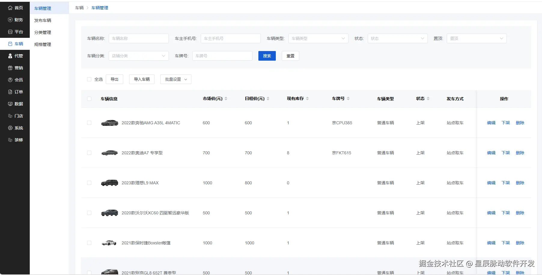 车辆管理:可导入、导出、筛选、编辑、发布、下架、删除车辆