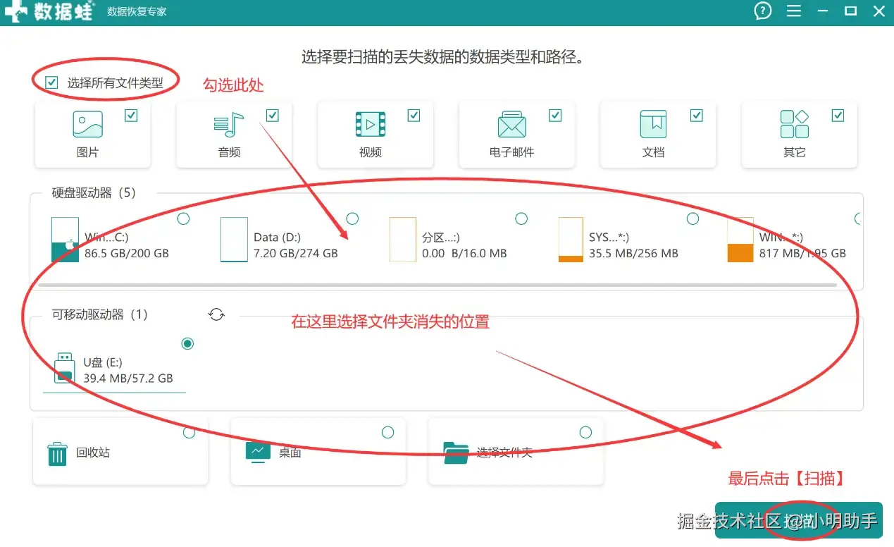 第1步: 运行这款软件,页面显示后,在上面勾选【选择所有文件类型】,然后选好文件夹丢失的位置,最后才点【扫描】。