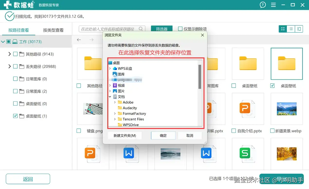 第2步: 出现扫描结果后,可以根据左侧软件自动归类的扫描文件中选择需要找回的文件。(需要完整地找回丢失文件夹建议选择【按路径查看】)