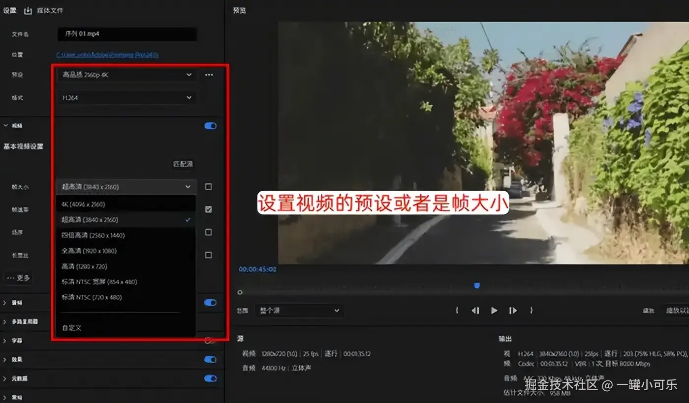 步骤2:在视频的导出界面中,设置视频的预设或者是帧大小,查看界面右下角的估计文件大小参数,调整到预期的视频大小后,点击【导出】即可。