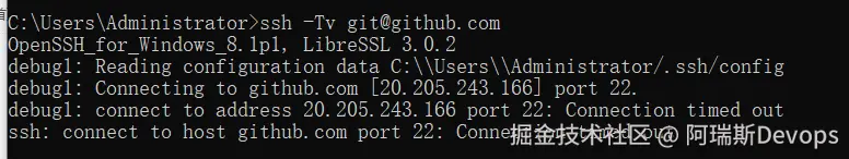 本地pull/push推送代码到github.com项目报错22端口超时,测试连接也是超时,如下图: