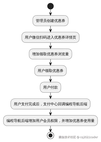最后在领取优惠券之后,我们要接收来自支付中心的回调,根据用户的支付信息给用户赋予对应的会员权限,同时设置用户领取的优惠券为已使用,这样用户就不能再使用这个优惠券了,同时我们也可以关联查询到优惠券的使用量让运营同学进行分析。