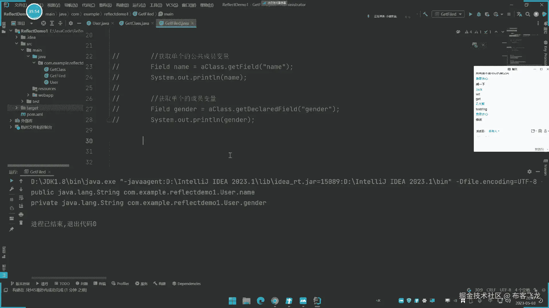 那么接下来我们是如何通过这个反思呢,获取这三个值的啊,要获取这个成员变量的一些东西的啊,那么接下来啊我们继续去写一个啊,叫做get啊,取个名字叫FIED是吧,好然后呢用这个文件来继续写啊。
