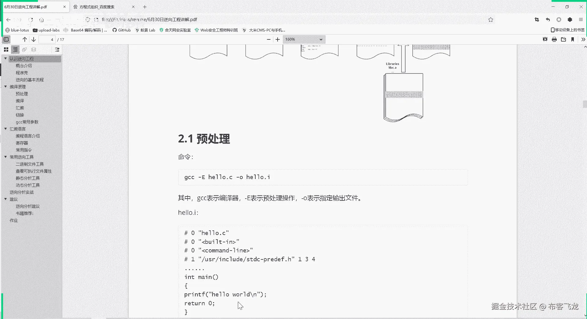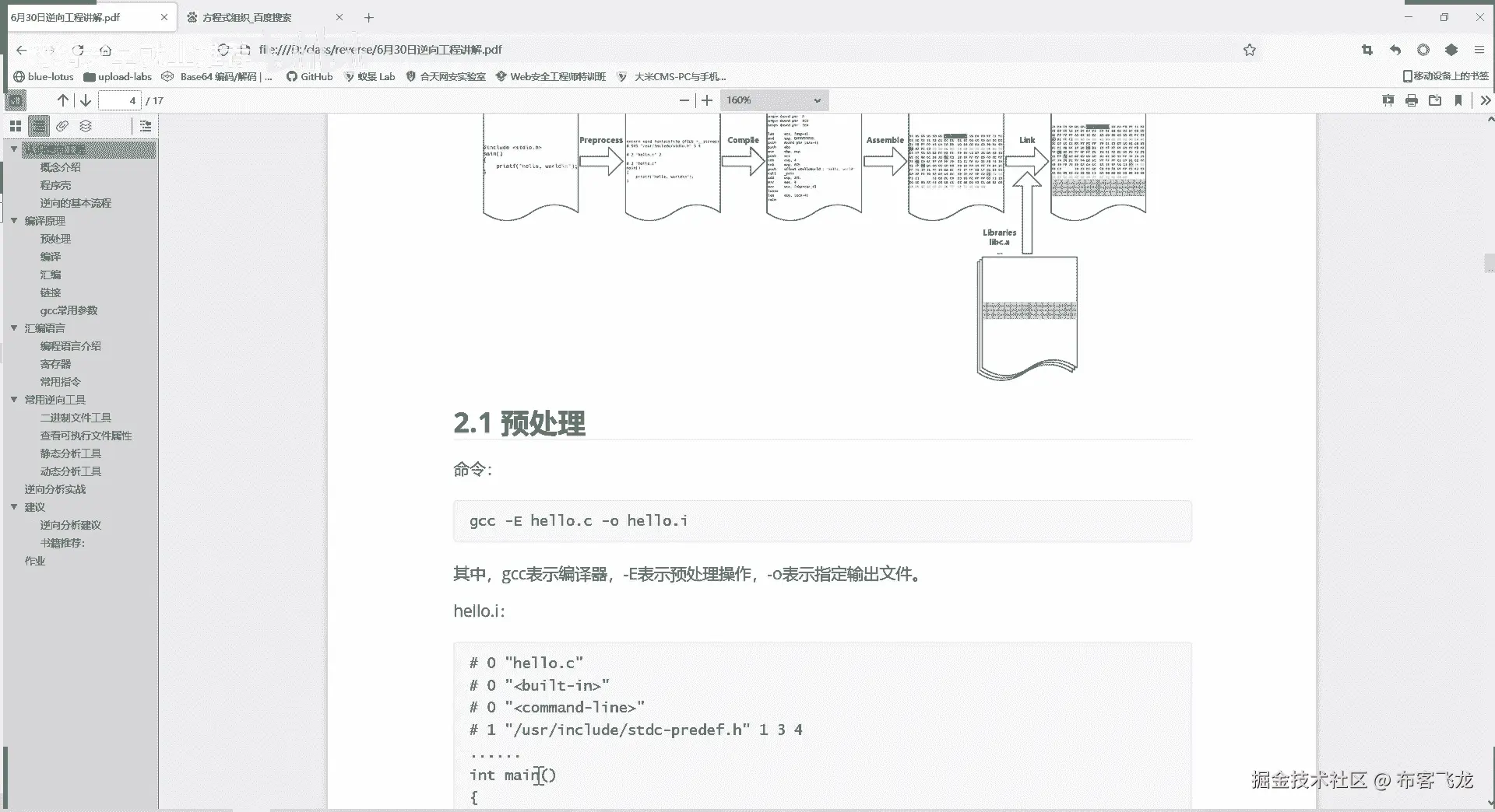 它直接编译他也是经过这四步,我们就不直接跳到最后了,我们看一下每一步的过程,详细了解一下它的工作过程,第一步呢就是gcc,使用杠e参数进行一个预处理,guo呢是输出输出文件的名字叫hello。i。