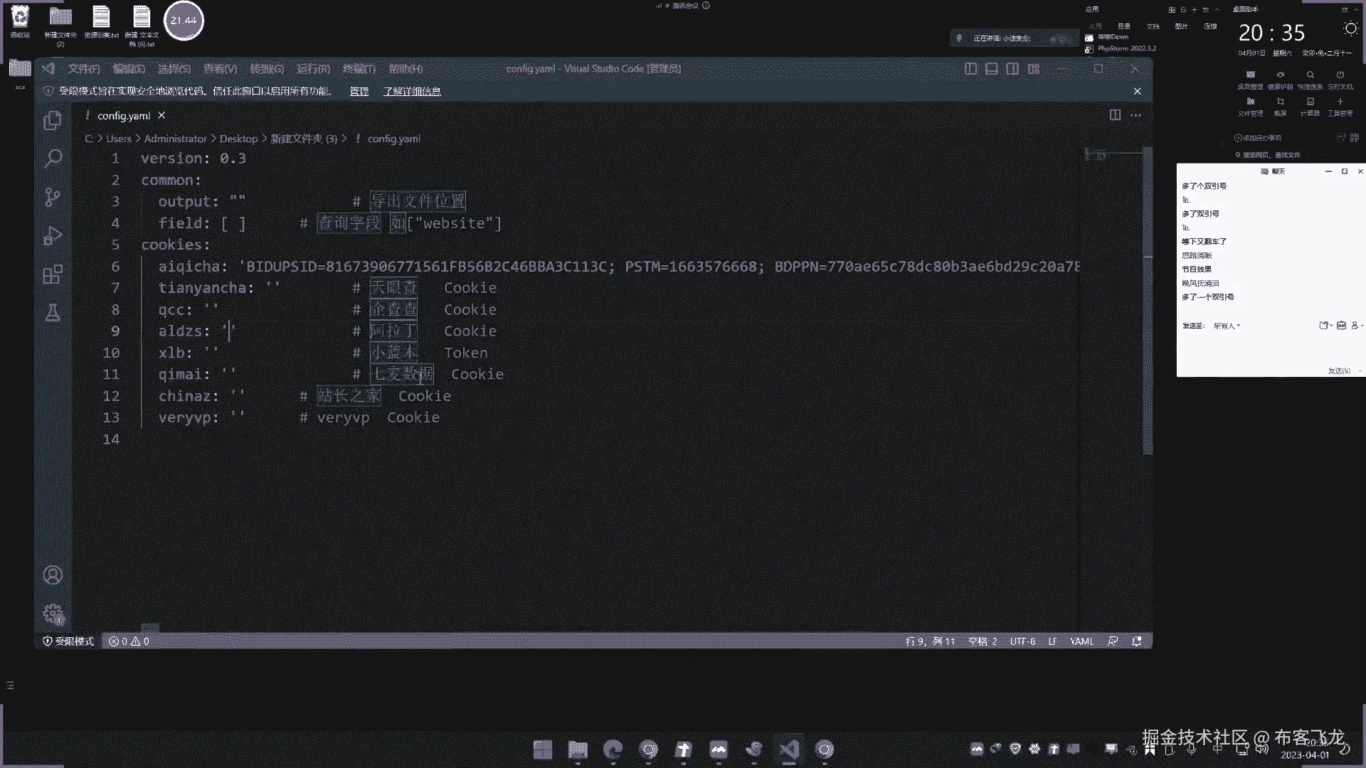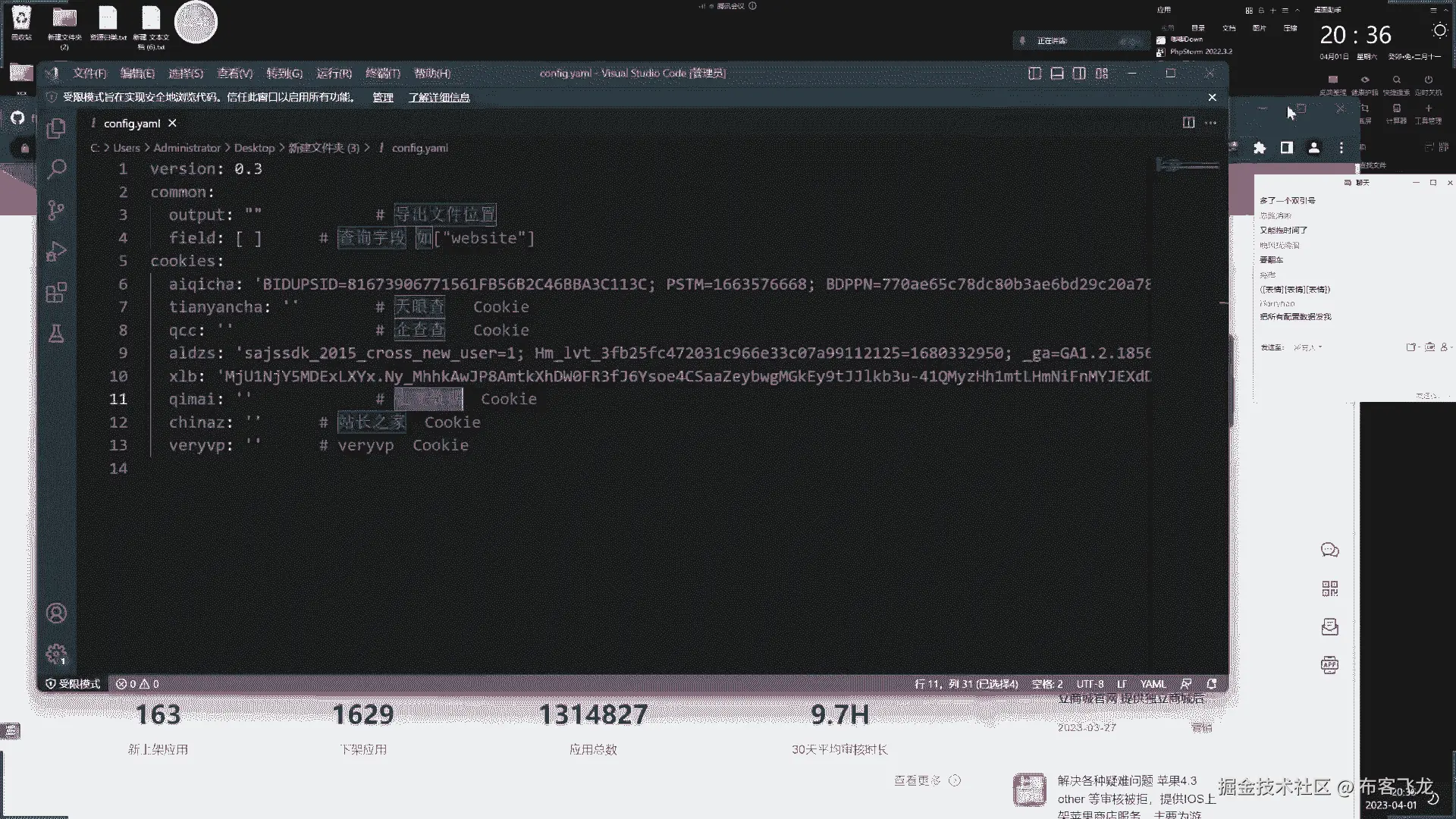 那配置文件是这个啊,然后呢你要在这个配置这几个接口的信息呢,这是爱奇茶,这是天眼查,这是奇茶茶阿拉丁小蓝本,奇卖数据站长之家,那这几个配置是cooking啥意思呢,来给大家演示一下啊。