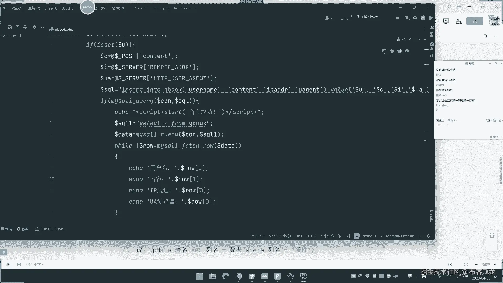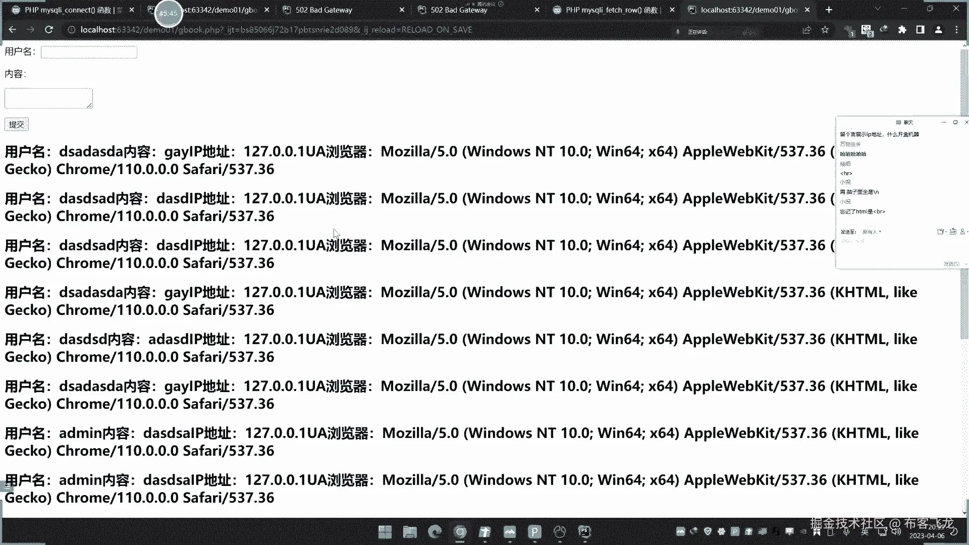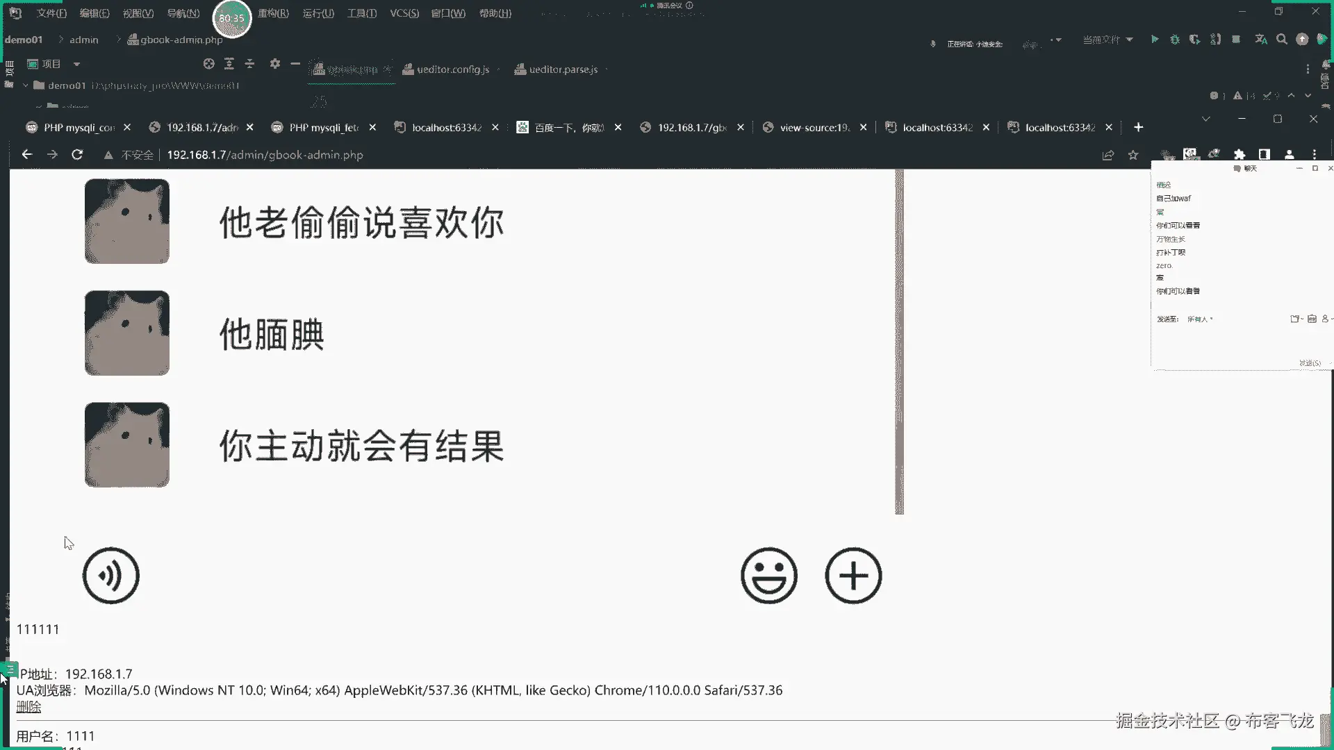 他是鹅的情况,这应该不是这个情况啊,留言成功了,正常留言是没问题啊,写了个rap的鱼就不行了啊,我就说这个一四就说你把这个写进去,然后呢他这个用户名字会显示,那显示呢其实就是把这个用户也会进行执行。