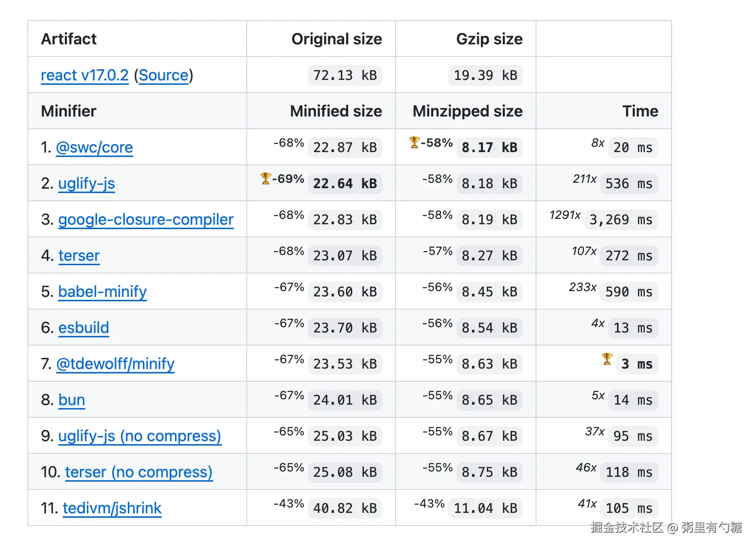 该仓库用于 JavaScript minifier 基准测试,测量了压缩的平均时间以及产物大小等关键的性能指标。