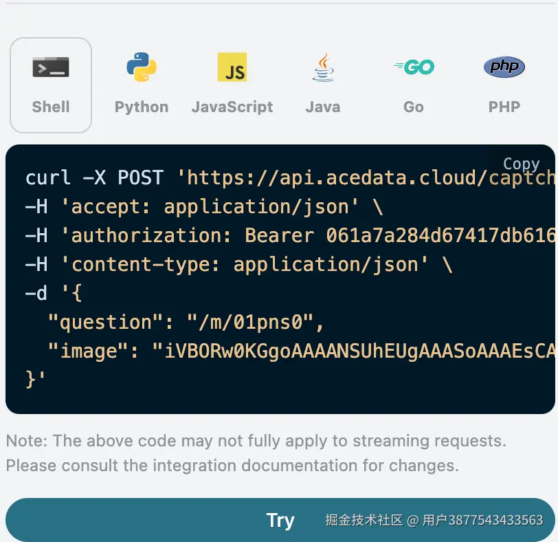另外如果想生成对应的对接代码,可以直接复制生成,例如 CURL 的代码如下: