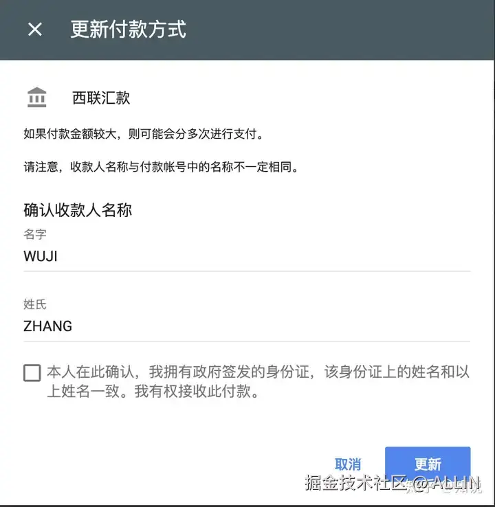 西联汇款的收款设置就简单多了,只需要设置收款人的姓名信息即可。