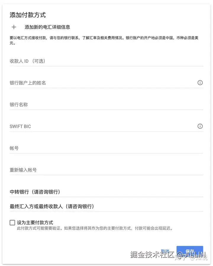- 付款人地区(选择:新加坡。目前Google是从新加坡付款,如有例外请根据实际填写)
