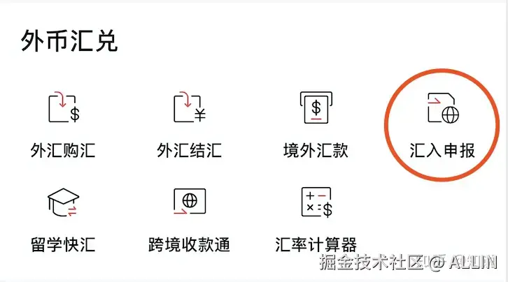 这时,我们登录招商银行手机网银进行操作,进入”跨境金融“ -> 外币汇兑 -> 汇入申报(或在招商银行手机网银App顶部搜索:汇入申报)。