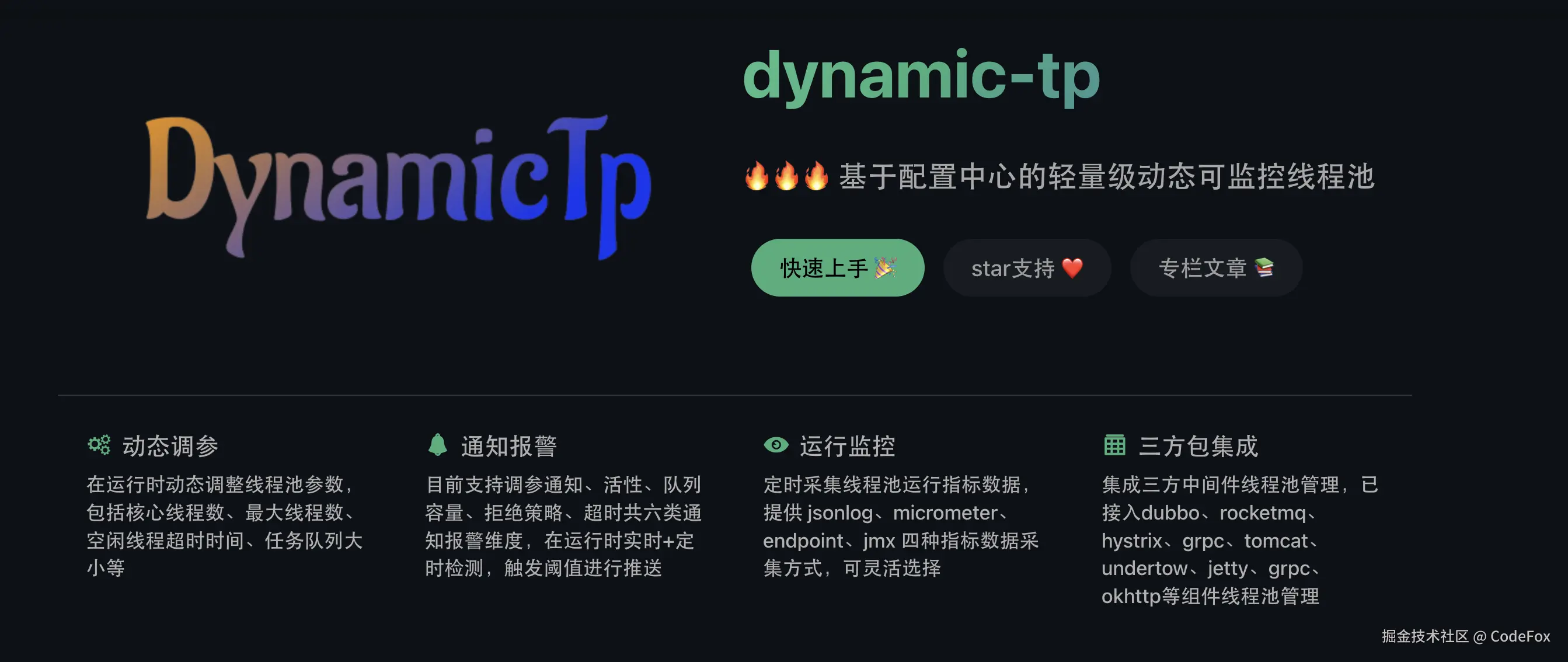 DynamicTp 是一款基于配置中心的轻量级动态线程池监控管理工具,主要功能可以总结为动态调参、通知报警、运行监控、三方包线程池管理等几大类。