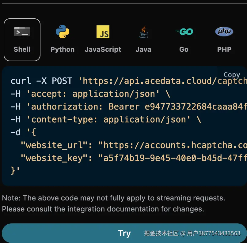 curl -X POST 'https://api.acedata.cloud/captcha/token/hcaptcha' \