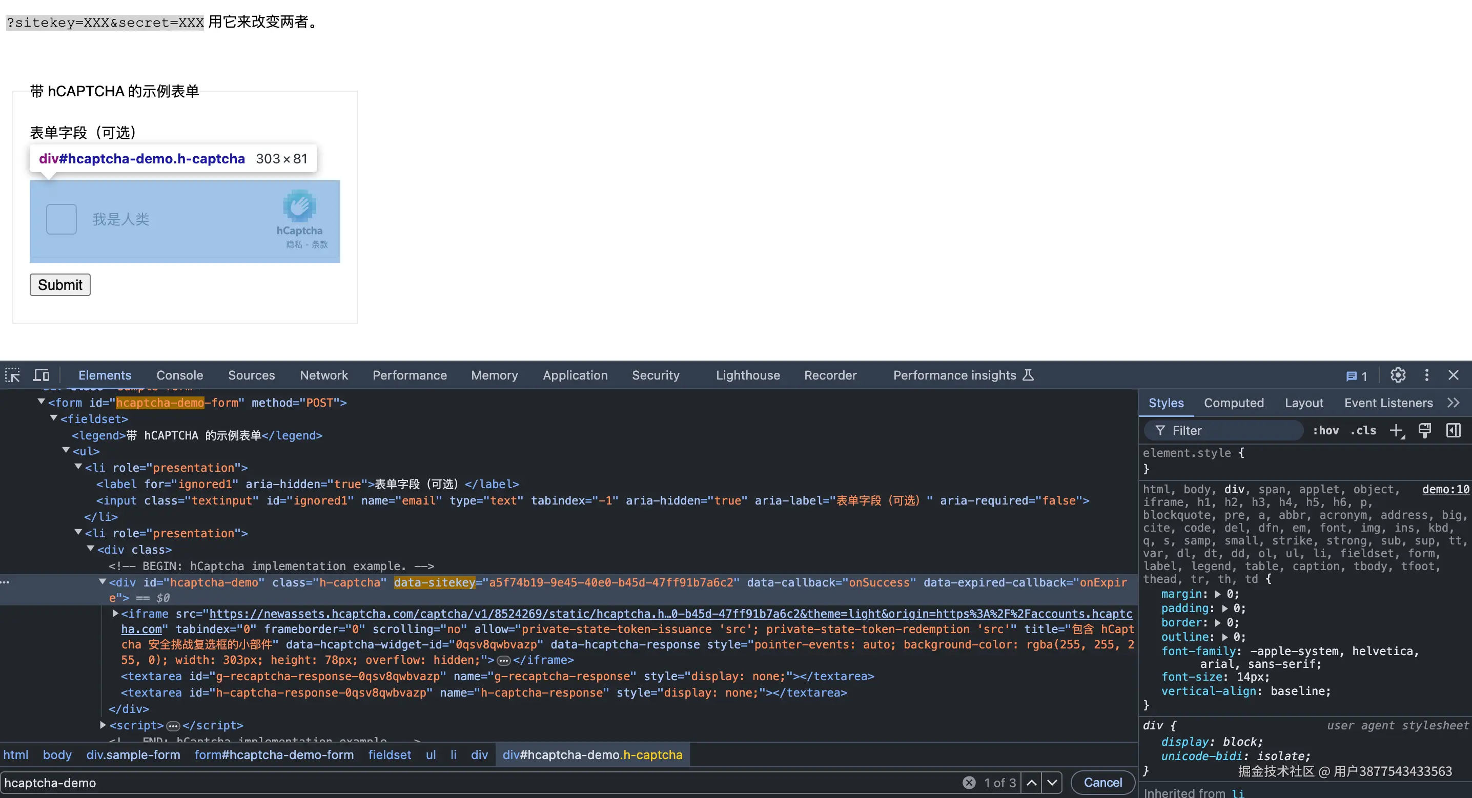 首先先了解下基本的使用方式,就是输入需要处理 hCaptcha验证码的网站URL,便可获得处理后的结果,首先需要简单地传递一个 website_url 字段,我们的示例网站是:https://accounts.hcaptcha.com/demo,我们需要在 website_url 页面中获取 website_key,首先需要打开这个网页,按F12进入控制台,最后在Element页面进行全局搜索 hcaptcha-demo,我们可以得到下面的结果: