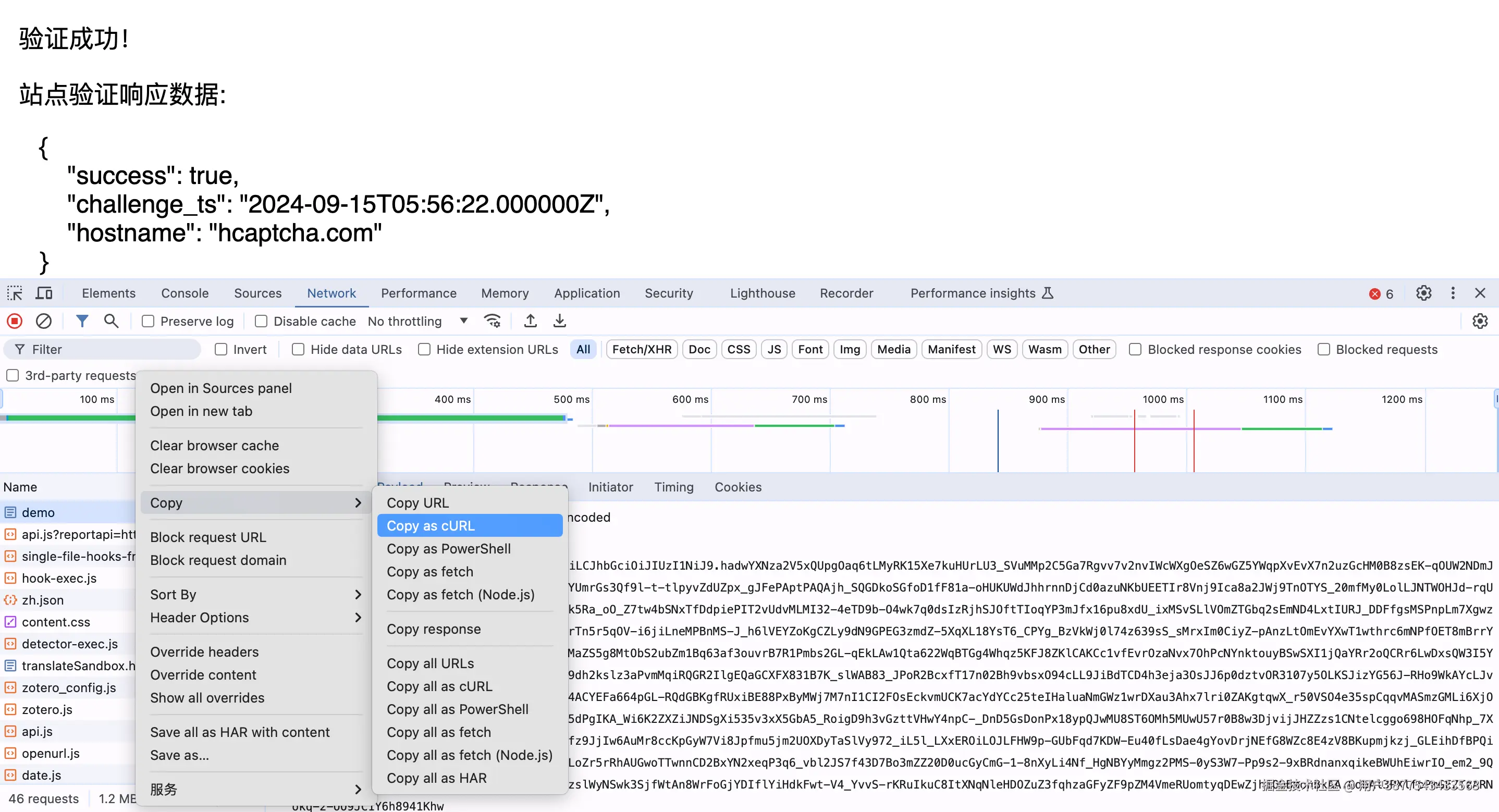 可以看到我们得到了处理 hCaptcha验证码 的验证结果,然后我们可以用于POST或模拟提交给目标网站,一次性使用,有效期120s,建议在60s内使用,接下来将提供一段CURL版本将处理后token提交到目标网站来通过Recaptcha2验证码。