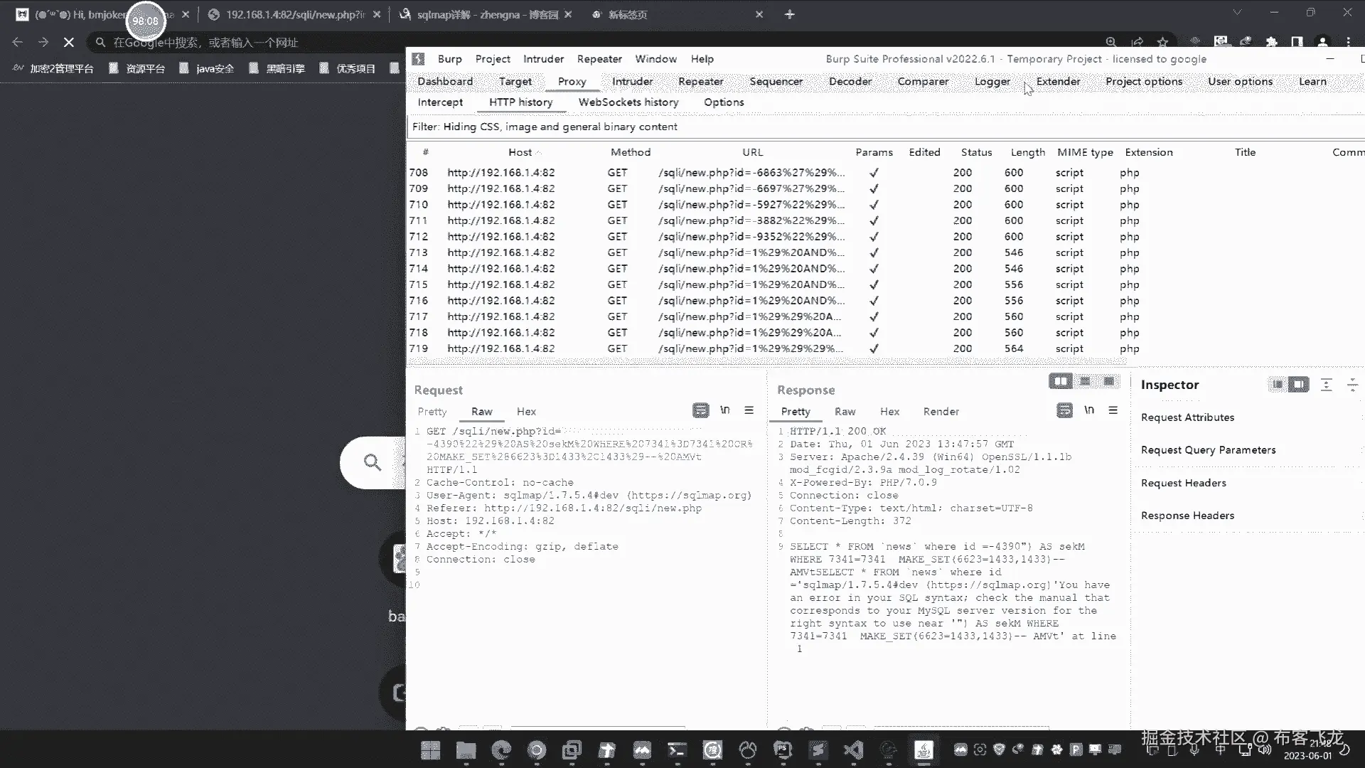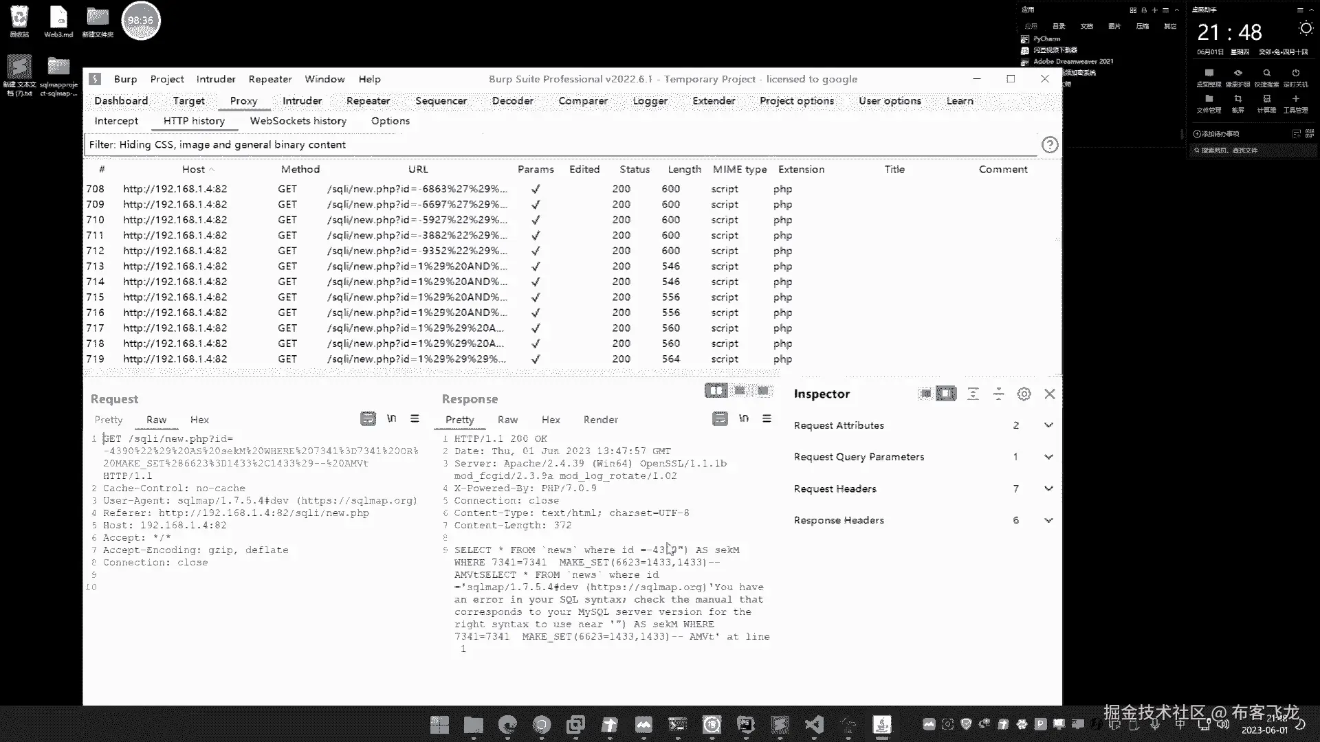 他就开始尝试书,那么一般看到这种黑色字体里面呢,如果在后面写成个叫might be injection啊,inject就是说可能存在注入,然后后面一个叫post apple dbms。