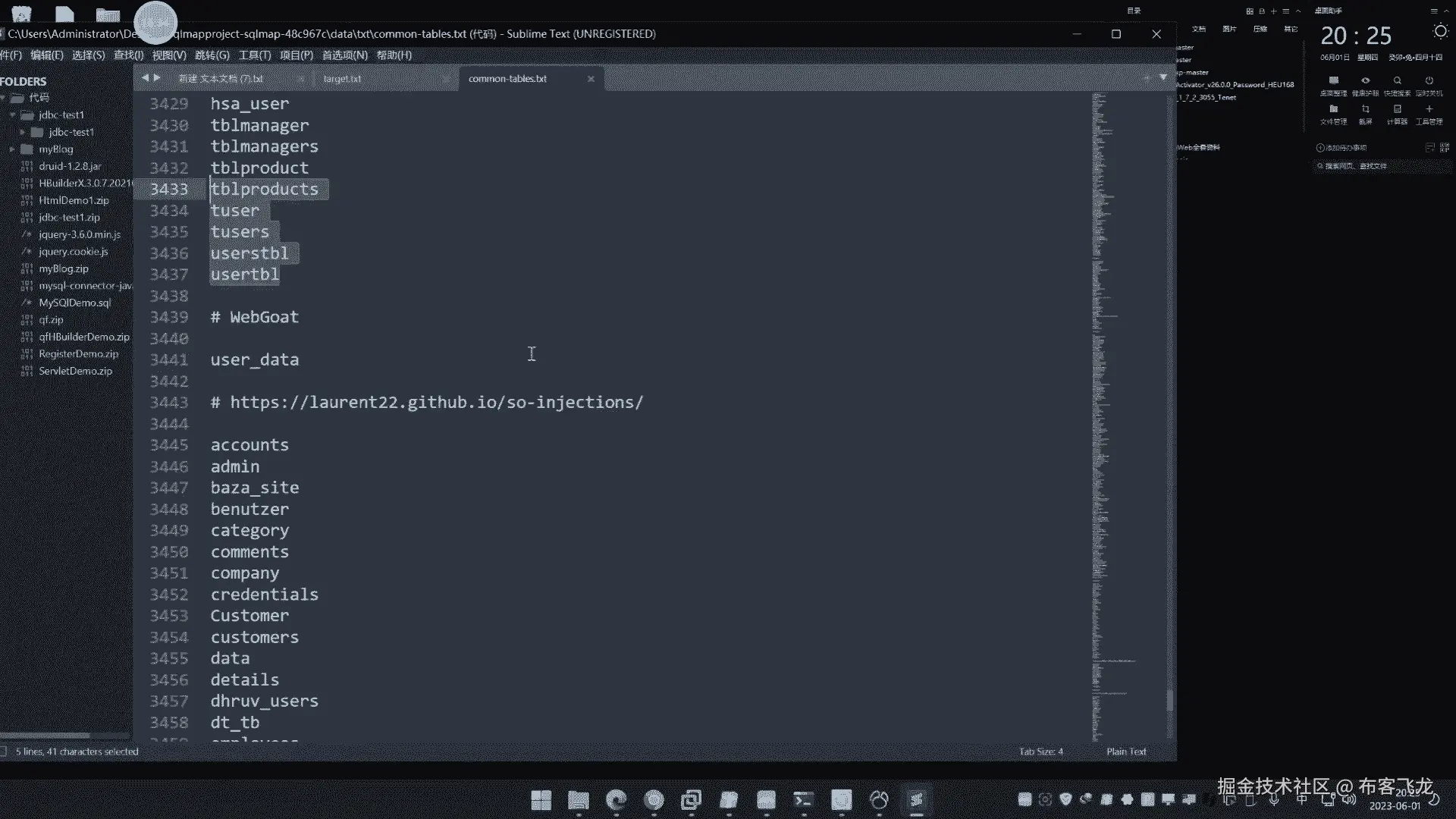 还是一样的道理啊,就是把数据库里面的表明了,尝试着修改,然后呢我们现在装它呢,去猜那个表是不是能够猜出来啊,啊好十个线程好,他就开始拆了,你看那么他这里是31一个,三千四百四一十一个呃。