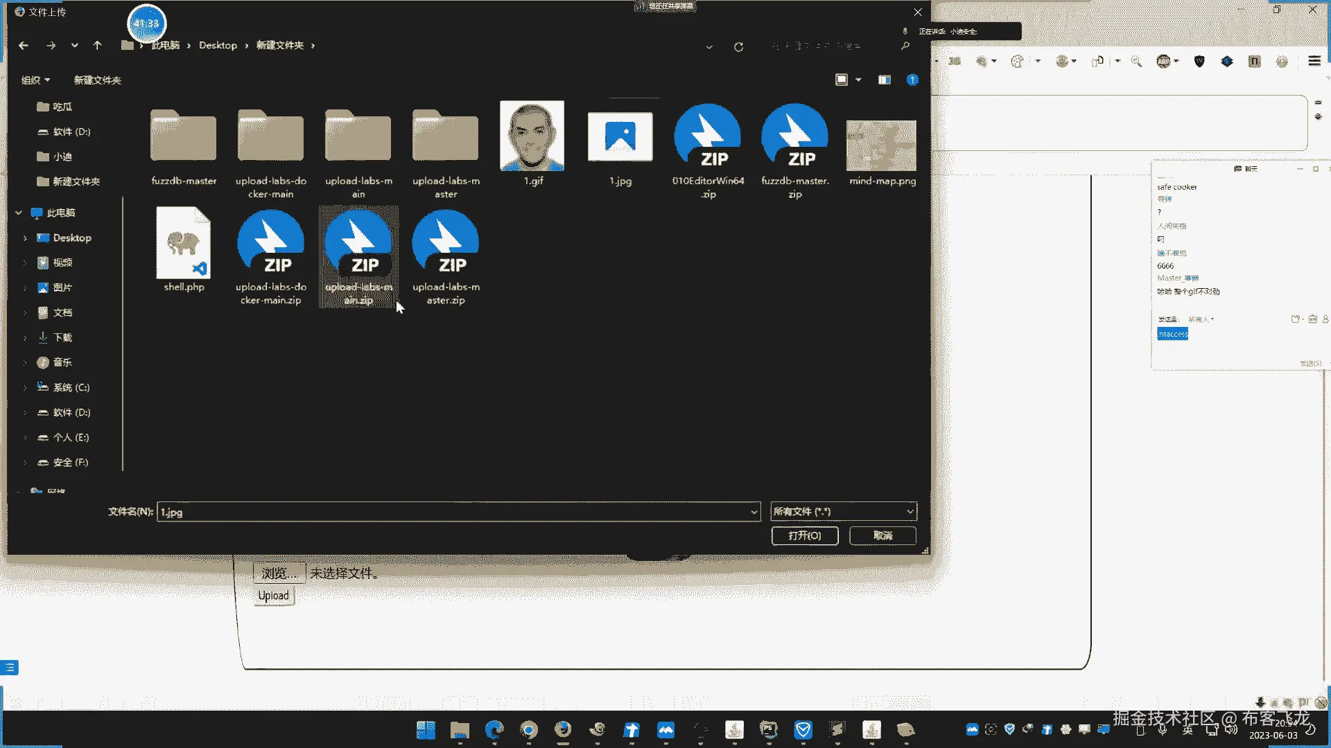 他雖然是白名單驗證,我們來看一下代碼啊,他雖然說這裡呢是白名單驗證,也是黑名單驗證啊,我們不用黑名單驗證log他,我直接上傳個圖片,但是他用那個Movie Upload,缺陷文件名和一個,這個名字呢。