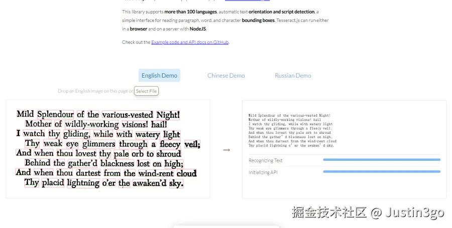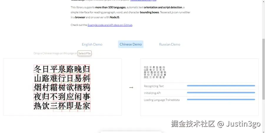 一个JS版本的OCR库,效果不错!支持中英文识别,github 34k star+。
