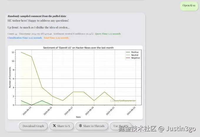 比如我想看看OpenAI最近发布的o1模型在Hacker News上大家对于它的情感倾向如何,我就可以使用这个网站,如下图: