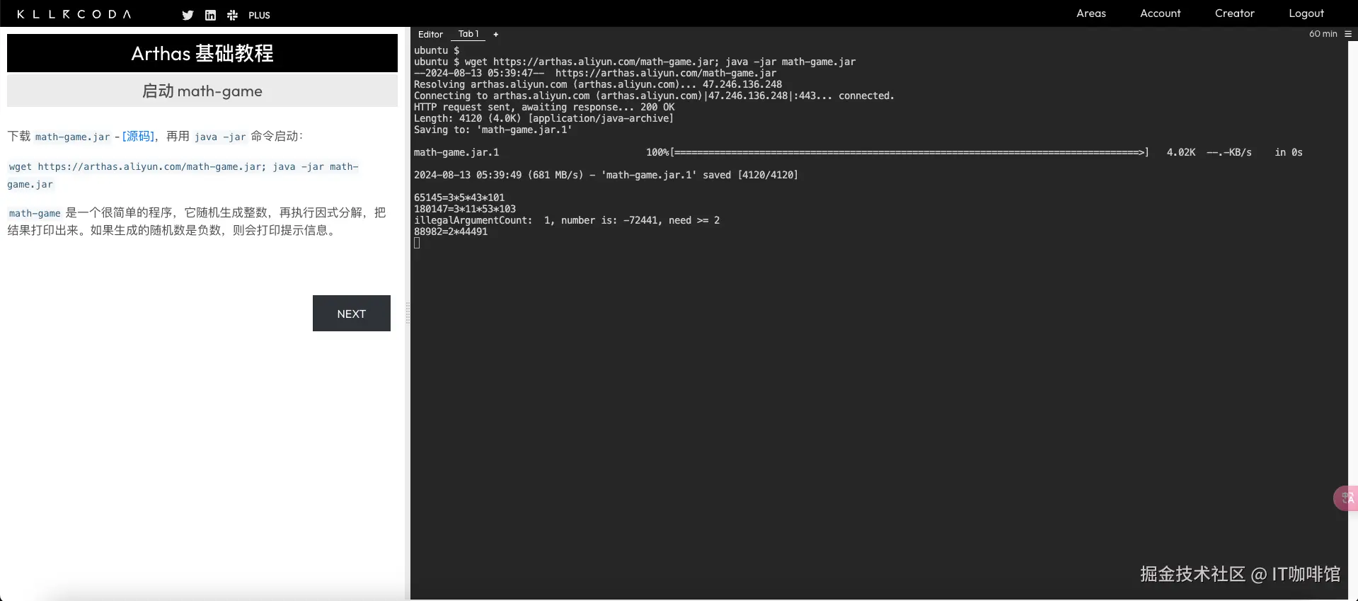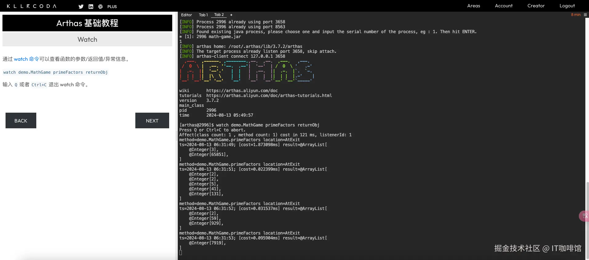首先如果你还没有完成上面的安装,也可以先来体验和试用,项目提供了在线的教程,它可以逐步让你掌握这款工具。用的是killercoda,这里我在用的时候遇到个问题,arthas网站内嵌的killercoda会无法认证登录,你可以直接访问killercoda,登录后自己搜arthas的课程即可。