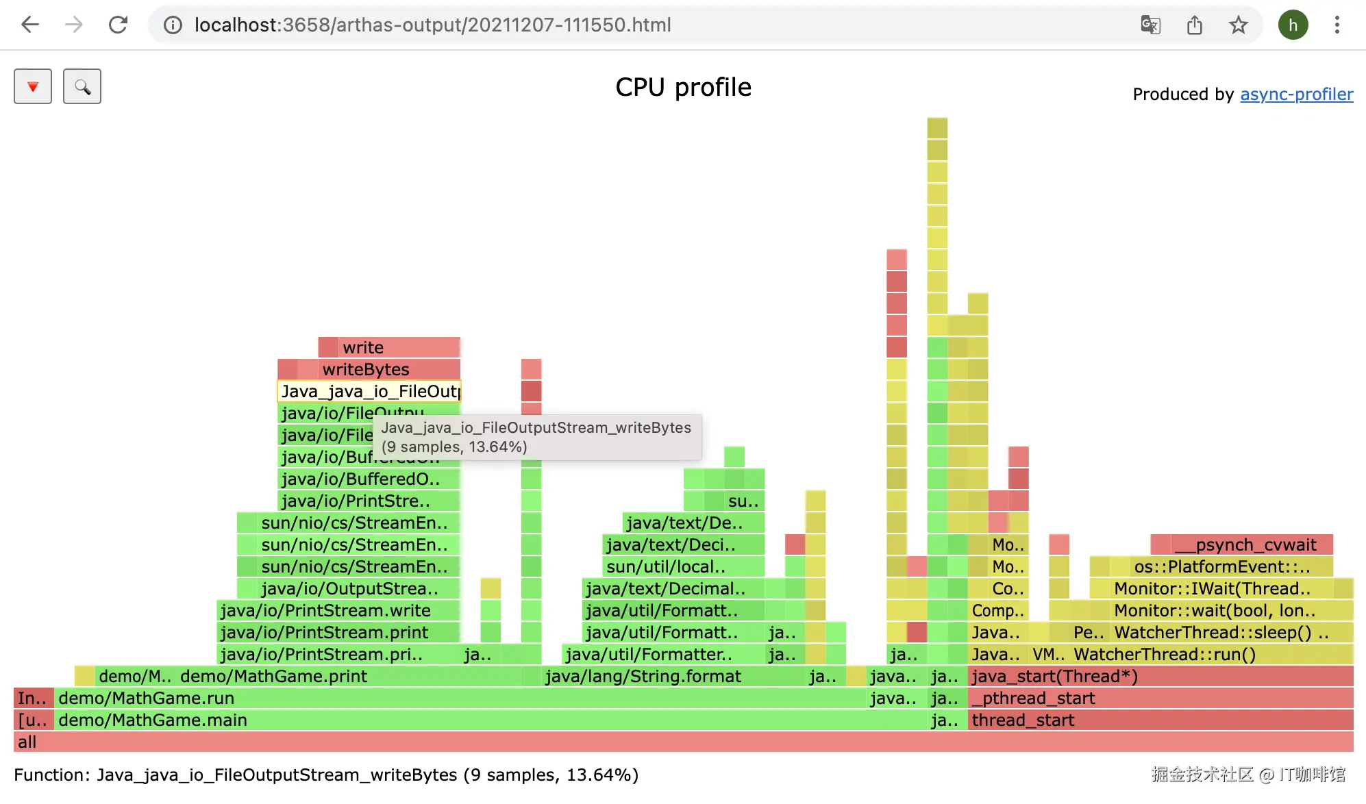 profiler 命令支持生成应用热点的火焰图。本质上是通过不断的采样,然后把收集到的采样结果生成火焰图。