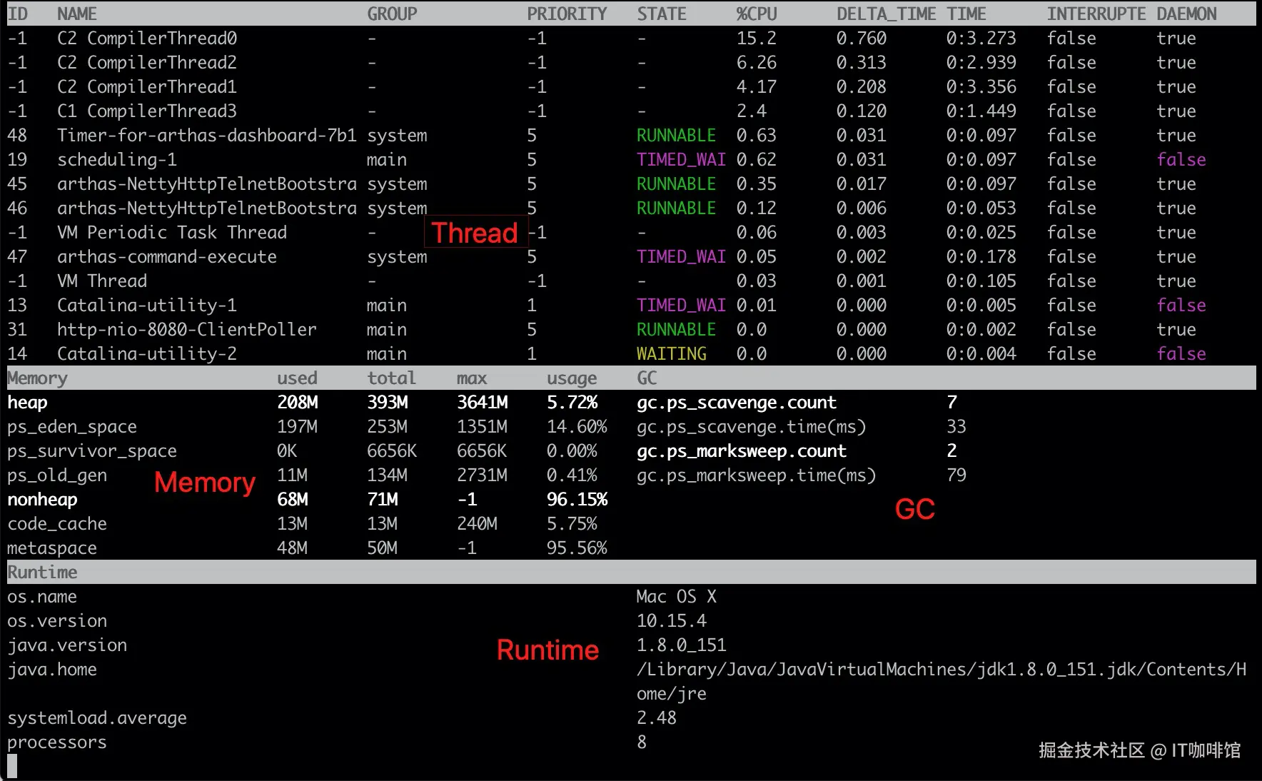 Arthas 提供一个实时查看系统运行状况的 Dashboard,方便开发者实时监控系统的负载、内存使用情况、GC 状态和线程状态。我平时一边干其他事一边还要盯着系统负载,有了 Dashboard,简直轻松愉快。