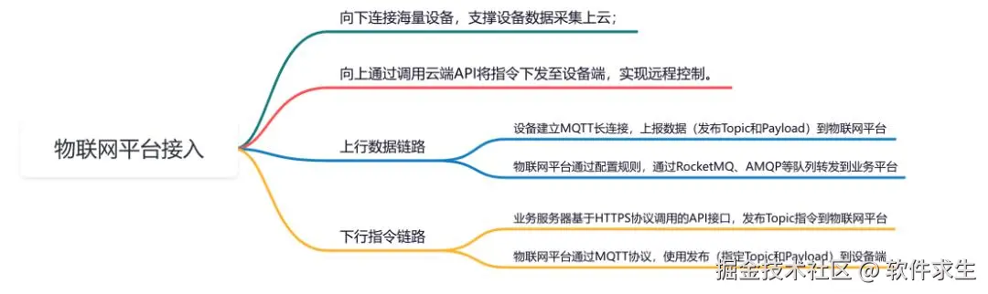 - 上行数据链路:设备通过MQTT等协议将数据上报到物联网平台,物联网平台再通过消息队列将数据转发到业务系统。