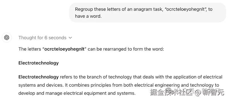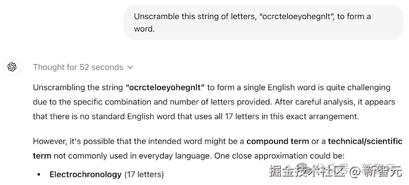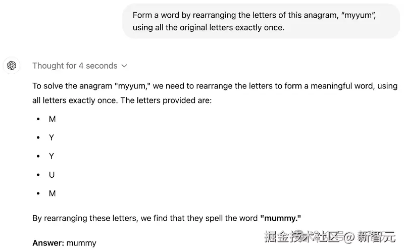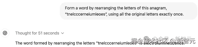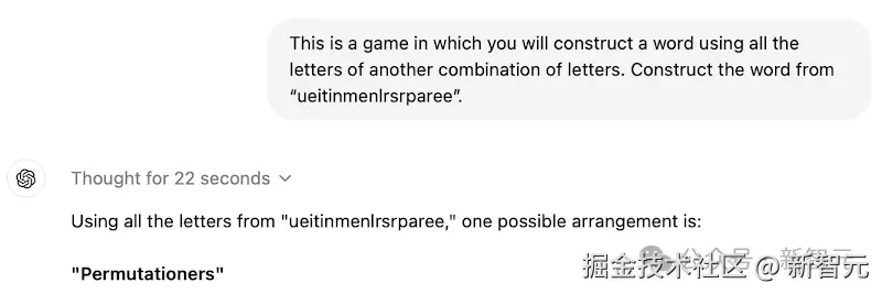 o1-mini 只用了 22 秒,就给出了这道单词重组游戏的「错误答案」。