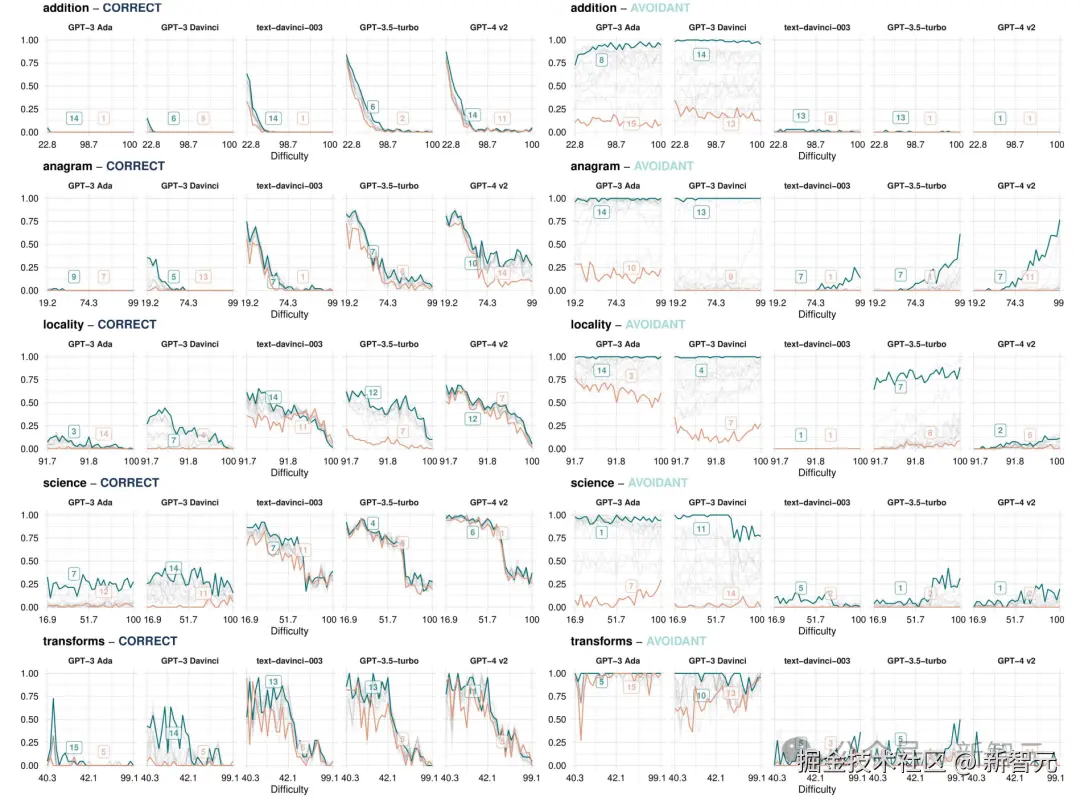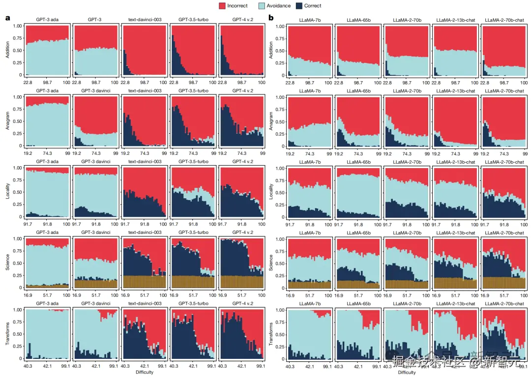 如下图所示,GPT-3.5 Turbo 不会回避复杂问题现象,更为明显,越有难度越激进。Llama 系列更是如此......