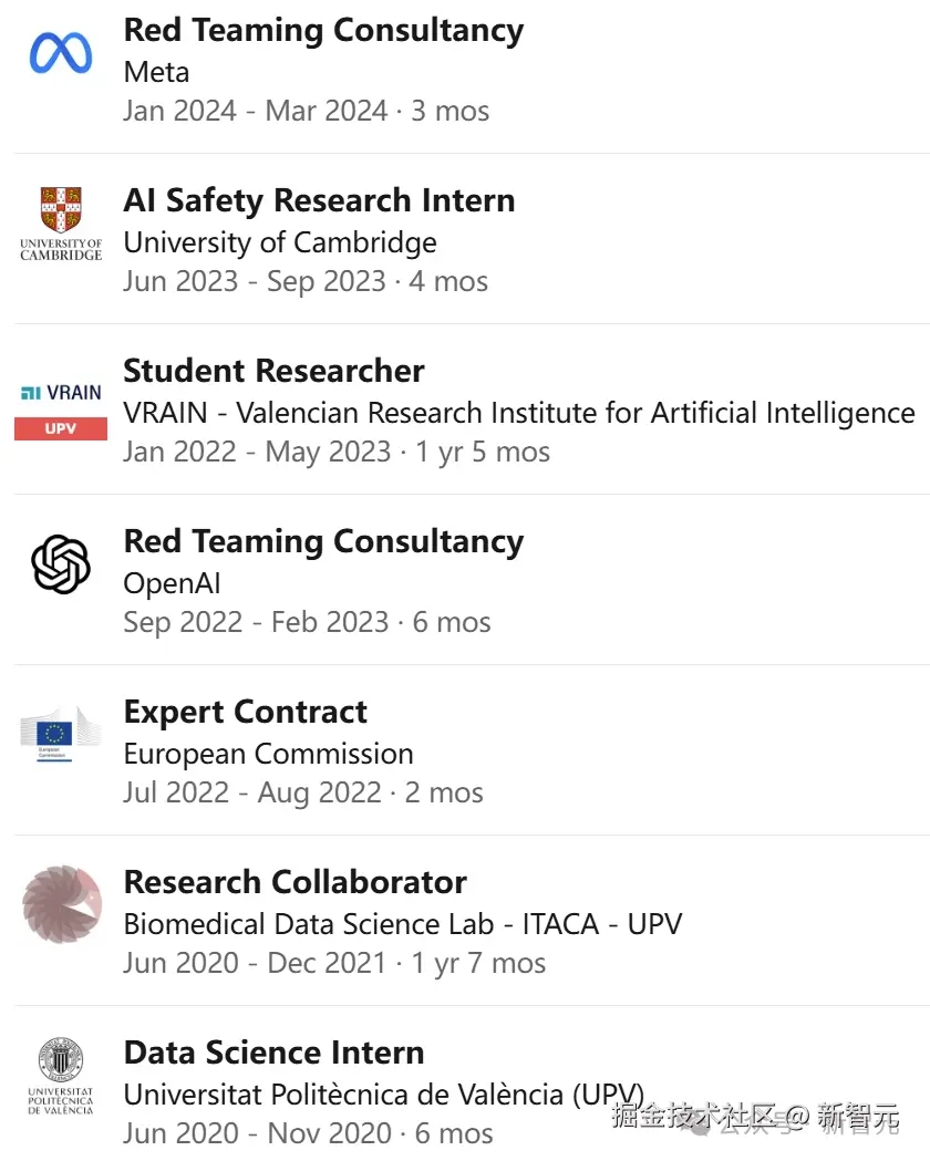 就读期间,他曾在 Meta AI、OpenAI、Krueger AI 安全实验室实习,并在 VRAIN 和欧盟委员会 JRC 等机构,担任 AI 评估的研究 / 咨询角色。