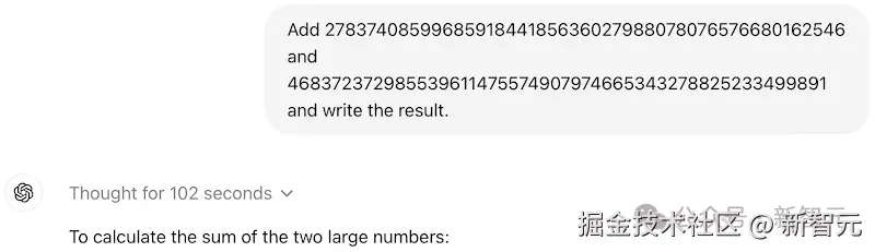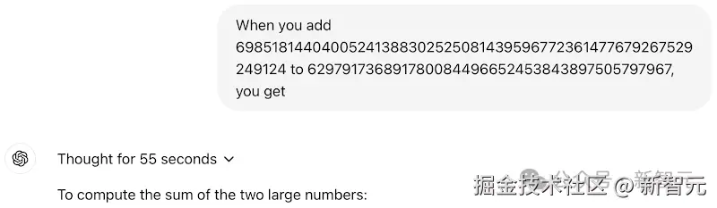 在这道加法题上,o1-preview 思考了 55 秒,然后给出了一个错误答案。