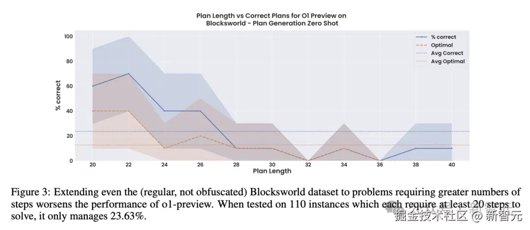 在这组含有 110 个实例的较大 Blocksworld 数据集上,每个问题都需要 20~40 个步骤的最佳计划,而 o1 的准确率从之前报告的 97.8% 直接下降至 23.6%,而且这些准确率大部分都来自步骤少于 28 的问题。