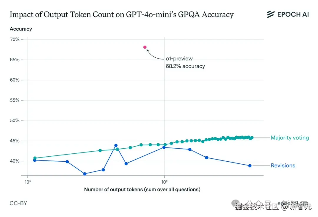 Epoch AI 团队的推算结果表明,即使在 GPT-4o 上花费 1000 美元用于输出 token,准确率仍将比 o1-preview 低 10 多个百分点。
