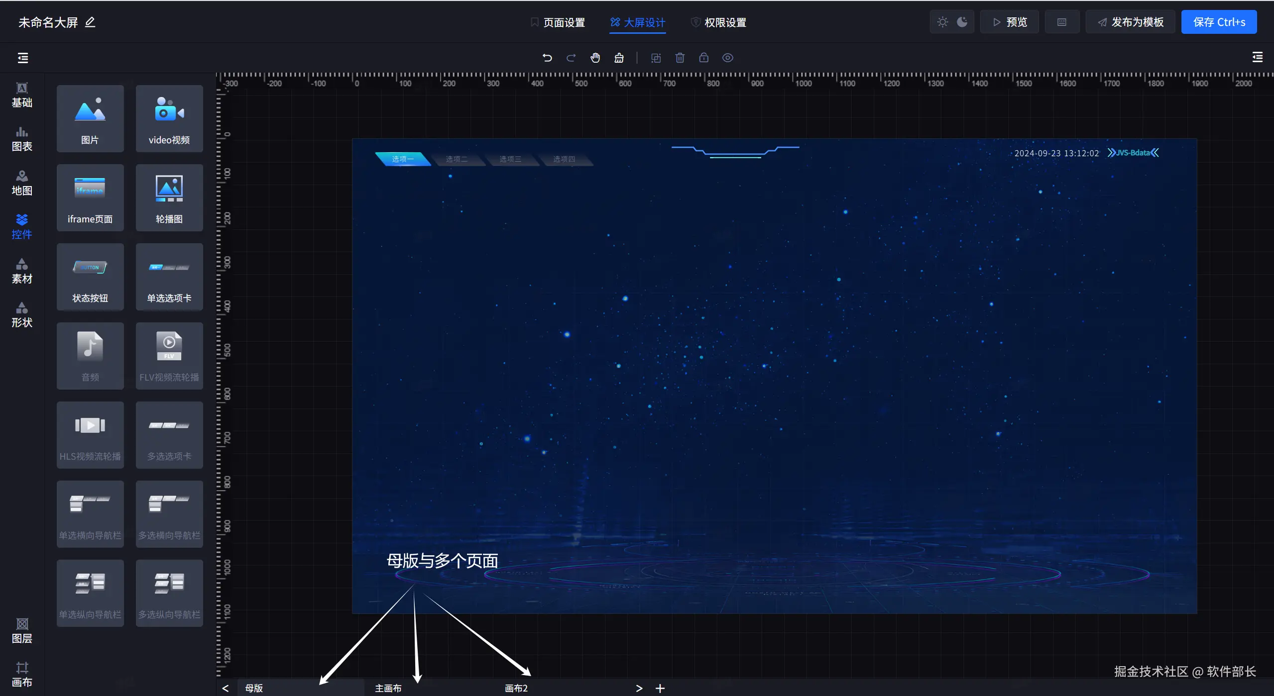 大屏设计母版是在大屏设计器中,用于在多个页面中展示相同的内容模版,且在各个页面中处于底层的展示,母版的作用