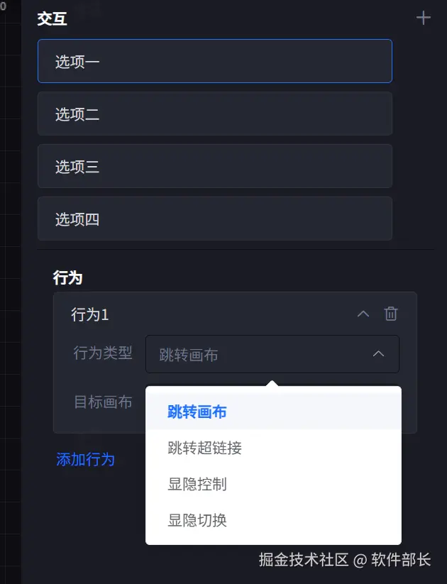 设置选项触发的行为,设置行为类型为,为跳转画布,并且设定好跳转到哪个页面上,这样快速实现通过母版配置跳转导航。
