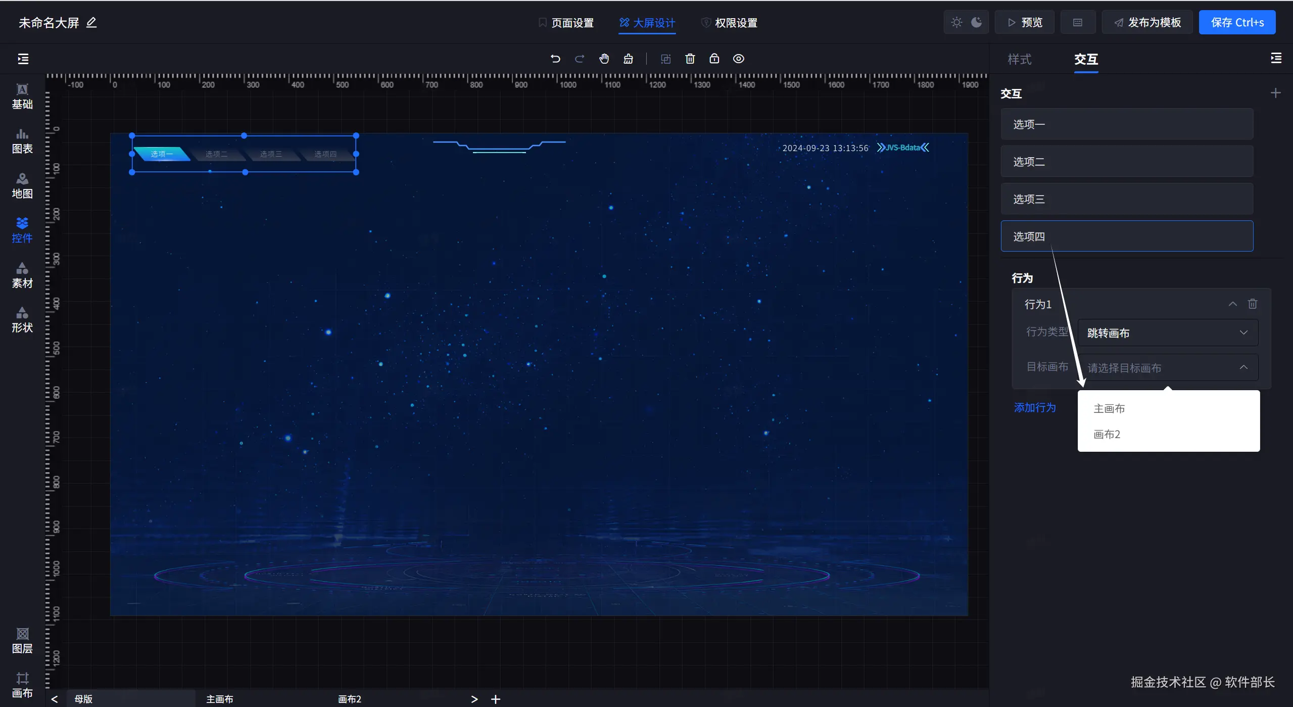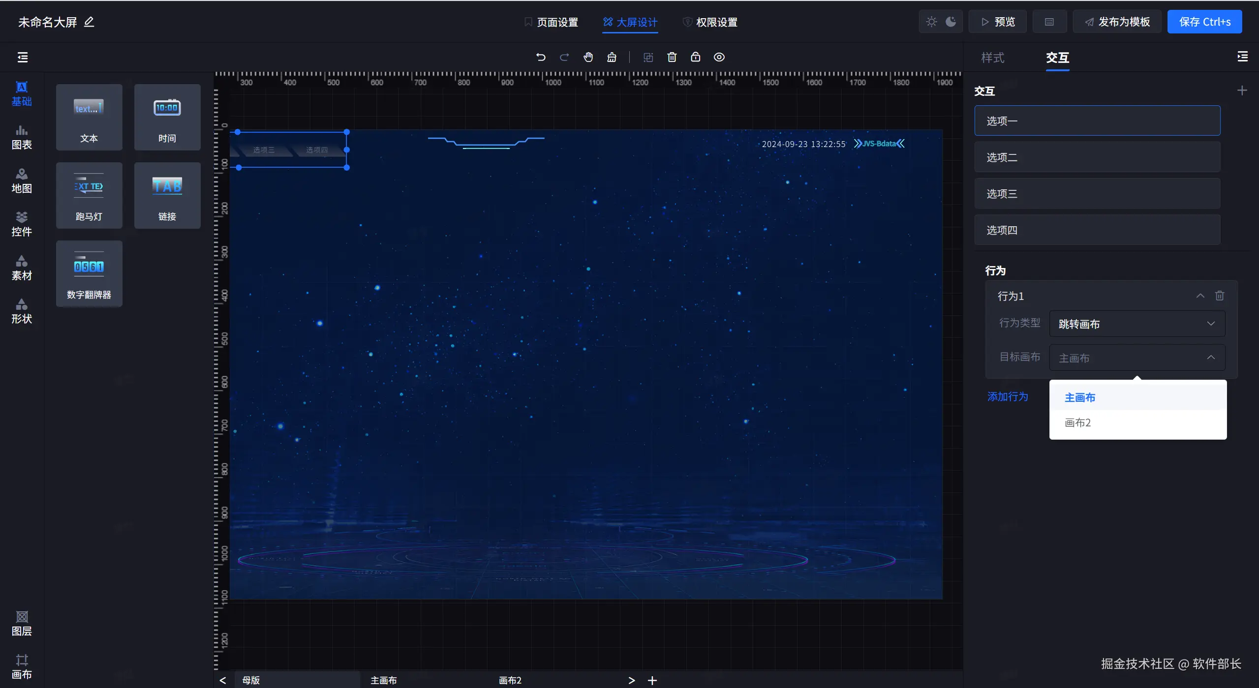 触发事件:在拖拽式配置的大屏设计器中,母版还支持触发事件的设置。这意味着,母版内的元素可以与页面上的其他元素进行交互,实现更复杂的动态效果。例如,点击母版中的某个按钮,可以触发页面上其他元素的显示或隐藏。