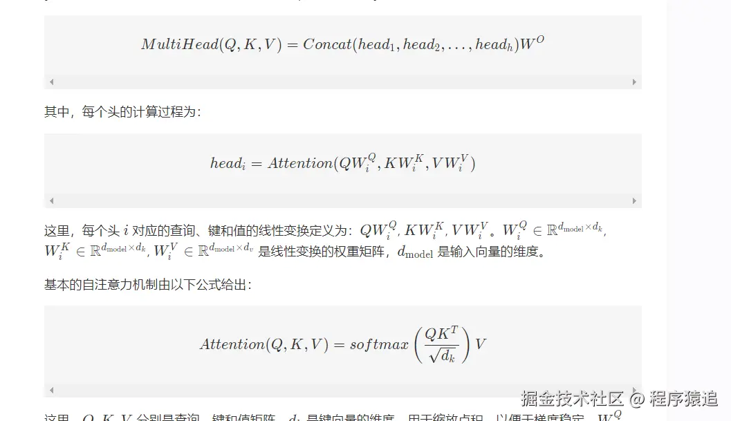 这里,QQ,KK,VV分别是查询、键和值矩阵,dkd k是键向量的维度,用于缩放点积,以便于梯度稳定。WiQW i Q,WiKW i K,WiVW i V和WOW O是模型参数,分别对应于每个头的查询、键、值向量的线性变换和最后的输出线性变换。