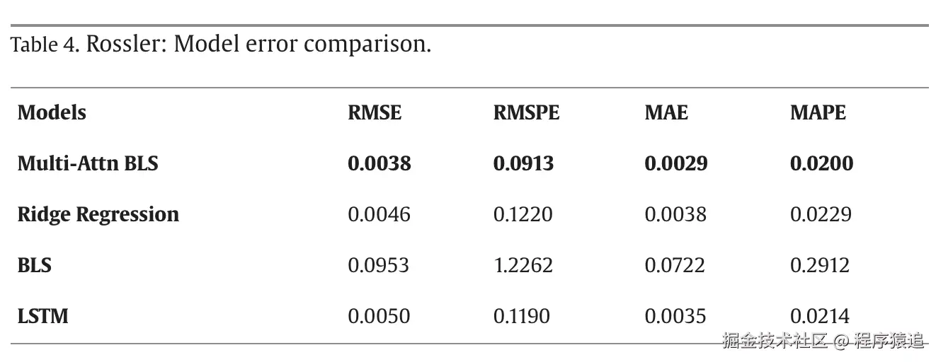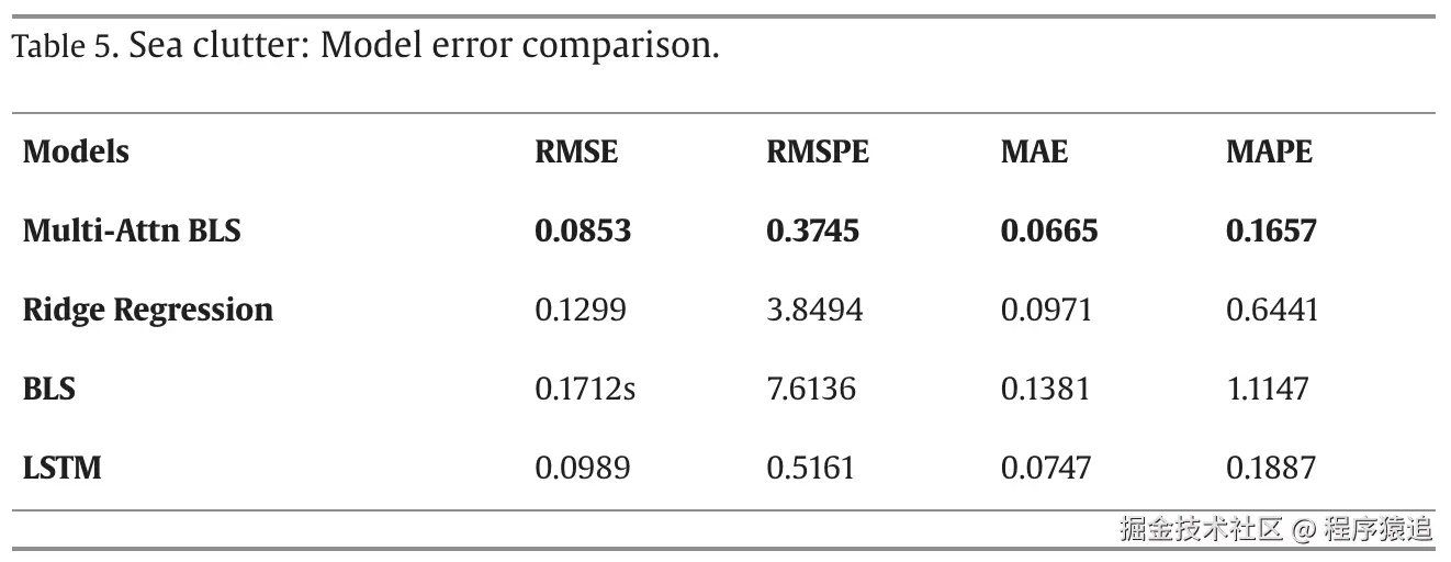 原文作者将他们所提出的模型在两份数据集上做了对比实验,结果如下图所示,可以看到Multi-Attn BLS在四类指标上都能取得最优值,其性能其优于岭回归算法、传统BLS模型和LSTM。