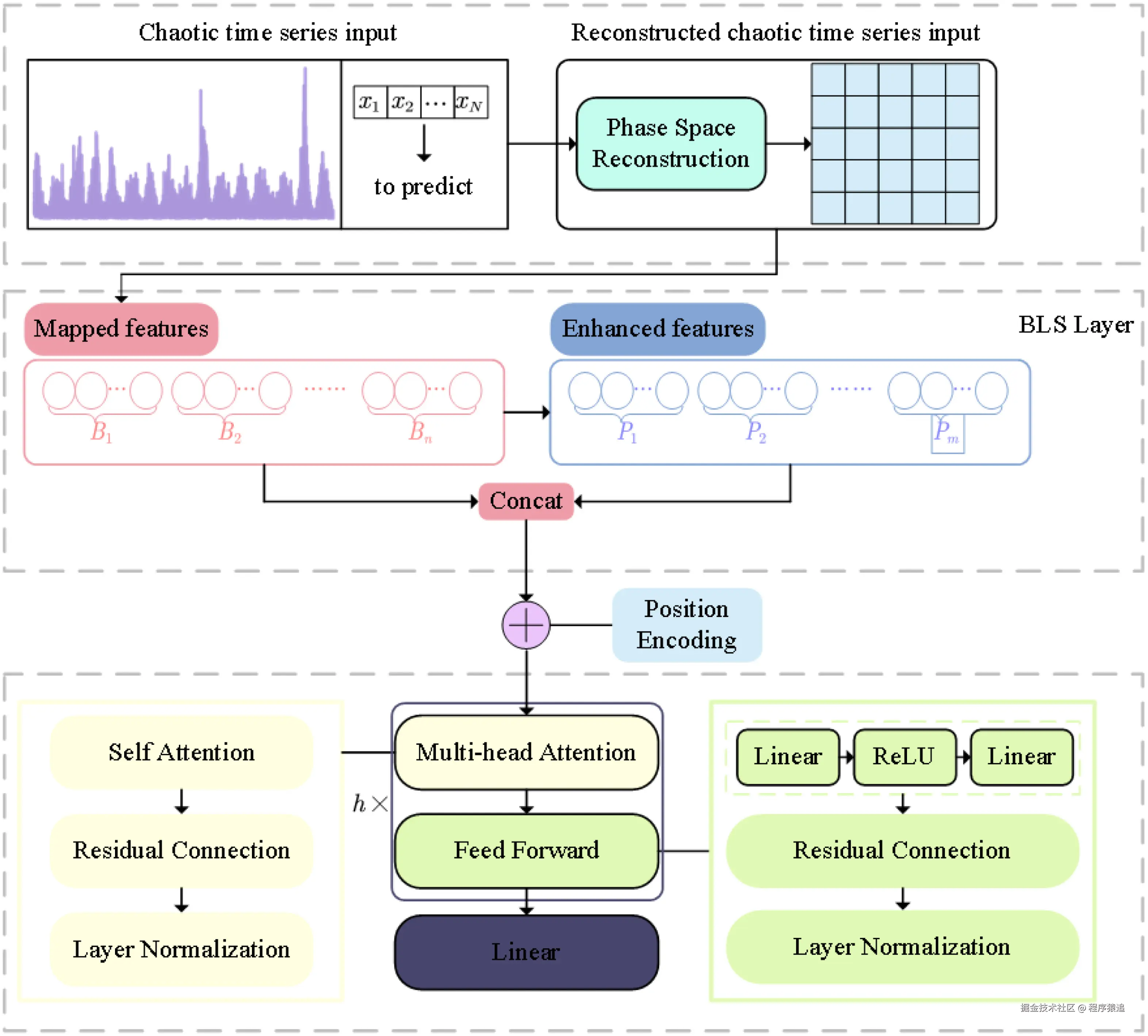 因此,作者提出了使用宽度学习系统(BLS)来扩展混沌时间序列数据的维度,并引入多头注意力机制来提取不同级别的语义信息,包括线性和非线性相关性、混沌机制和噪声。同时,他们还利用残差连接来确保信息完整性。
