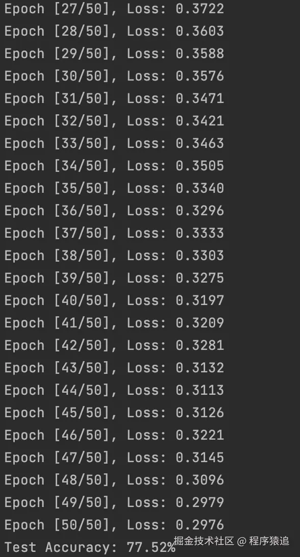 我基于本地的数据集做了一份分类任务,可以看到随着epoch增加,训练损失在不断下降,测试的准确率可以达到77.52%,还不错的结果。大家可以根据自己的需要修改模型的输出层来适应不同的学习任务。