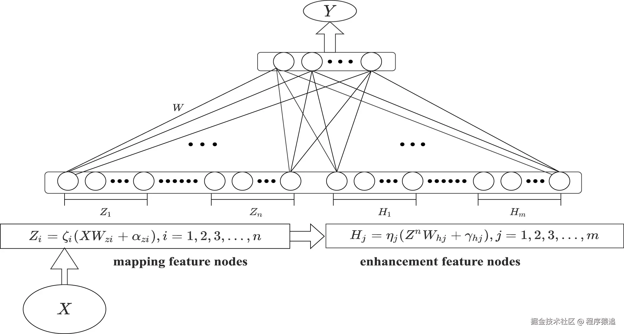 BLS的整体架构如上图所示,在这里我们实际上只用到了它的映射能力,即特征节点层和增强节点层,也就是上面的mapping feature nodes和enhancement feature nodes。这两层的搭建方法如下:假设有输入的经过预处理后的时序数据集为[XX,YY],其中XX是包含NN个样本的输入数据,每个样本有MM个维度,YY是输出结果也包含NN个样本,每个样本有KK个维度,代表每个样本所属的类别。首先,输入数据XX通过下面的等式转换成nn组映射特征层,每组有kk个节点。
