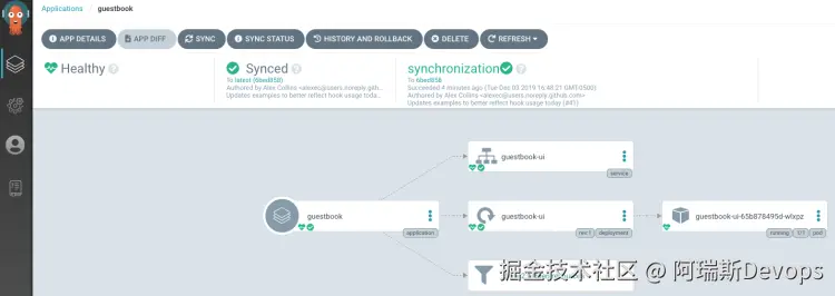 此命令从存储库中检索清单并执行kubectl apply清单中的一个。留言簿应用程序现在正在运行,您现在可以查看其资源组件、日志、事件和评估的运行状况。