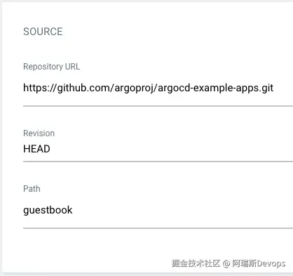 通过将存储库 url 设置为 github 存储库 url,将https://github.com/argoproj/argocd-example-apps.git存储库连接到 Argo CD,将修订保留为HEAD,并将路径设置为guestbook: