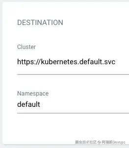 对于Destination,将集群 URL 设置为kubernetes.default.svc(或in-cluster集群名称)并将命名空间设置为default: