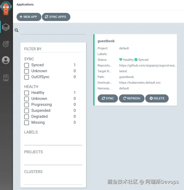 应用状态为初始OutOfSync状态,因为应用尚未部署,还没有创建 Kubernetes 资源。要同步(部署)应用程序,请运行: